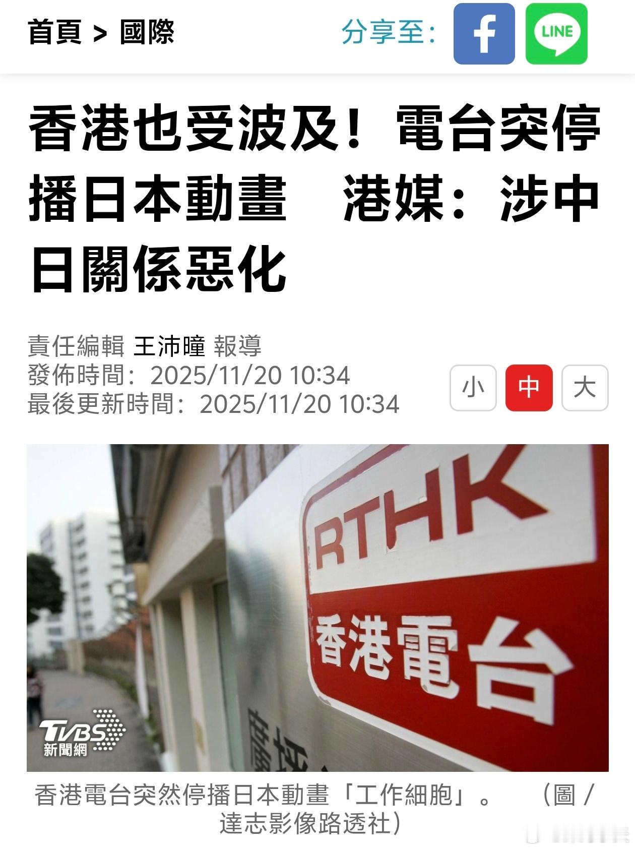 跟随中央步伐,香港电台停播日本动画港媒信报报道,香港电台电视节目停播了日本动画片「工作细胞」;这部动画片早前在该台首播,但第二季突然被抽起,改为播放另一体育节目。报导指出,在港台介绍该动画片的页面上,上周已播出的第一集回顾及第二集预告,同样消失得无影无踪。早前内地影院陆续宣布日本动画电影「蜡笔小新:炽热的春日部舞者们」和真人版漫画改编作品「工作细胞」暂缓上映,因此,港媒估计,中日关系是当下最政治敏感的话题之一,港方参考大陆风向是「安全系数」最高的做法。港台回复该报查询时表示,港台不时检视节目播放安排,为公众提供优质的节目及资讯,又指第15届全国运动会首次由粤港澳三地共同承办,港台也作出节目调动,加强播放相关节目及资讯,为出战的香港运动员打气。