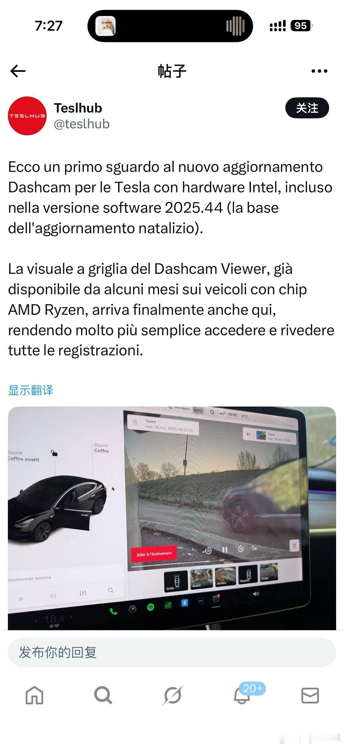 特斯拉2025.44更新为Intel硬件车型带来了Dashcam网格视图功能!此前该功能已在AMD车型上线数月,现在Intel车主也能更方便地查看和管理行车录像了🎄