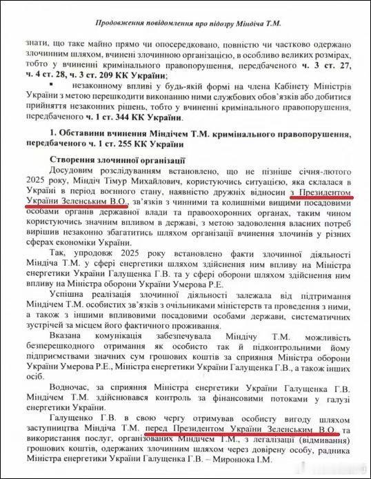乌克兰国家反贪机构的起诉书。起诉书中乌克兰总统泽连斯基在对明迪奇的能源腐败指控中被列为关联人物,起诉书称,明迪奇利用与泽连斯基的私人关系,企图通过组织乌克兰多个经济领域的犯罪活动非法牟利。文件明确指出,这位寡头在时任国防部长乌梅罗夫的协助下开展犯罪活动,通过其名下企业侵吞国防部资金,乌克兰国家反贪局此前表示,明迪奇仅是傀儡角色,真正具有"政治意愿"的实际受益人另有其人。
