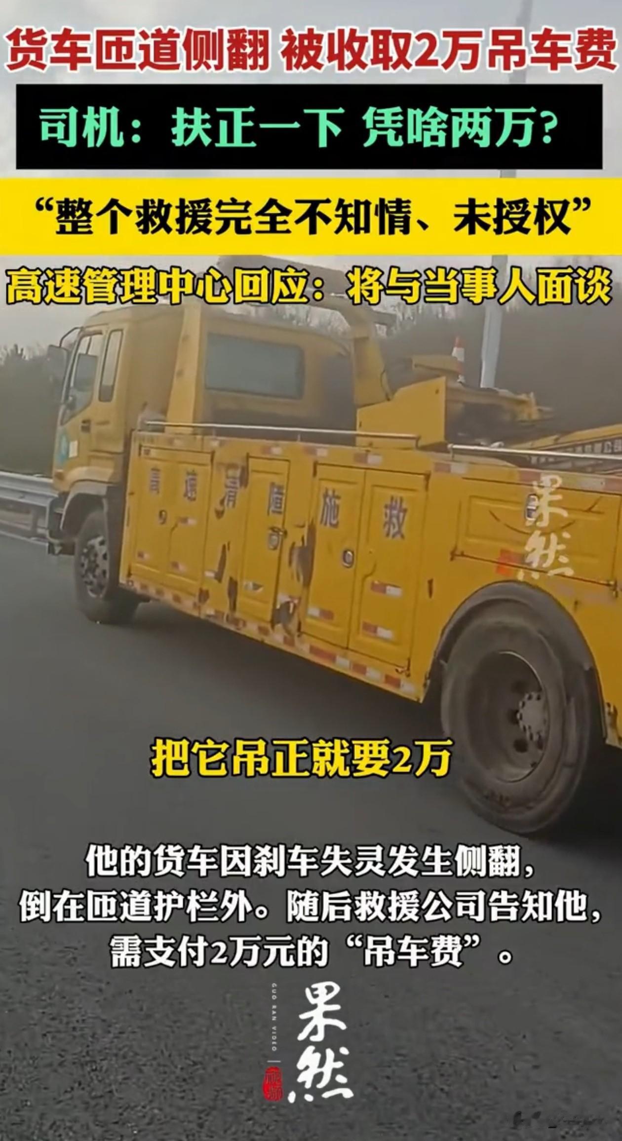 简直是抢钱!江西抚州一货车侧翻,司机没喊救援队,他们自己却派了2辆吊车来,把车子给扶正了,张嘴就冲司机要2万的吊车扶正费! 11月18日凌晨5点多,司机杨师傅开着他那辆半挂车往浙江运泰国龙眼,结果刹车突然失灵! 眼瞅着就要撞上护栏,他一咬牙猛打方向盘,车“哐当”一声侧翻在高速匝道外头。万幸人没什么大事,就是车翻得七零八落,龙眼撒了一地。 交警来了一量责任,认定杨师傅全责,然后就火急火燎地带杨师傅去了医院,先处理一下伤口。 可杨师傅刚从医院回来,就看见两台吊车把车扶正了,张口就要2万块!杨师傅当场就懵了:“我也没喊救援啊,再说吊车扶正一下,咋比运一车货还贵?” 更气人的是,救援前压根没人跟他商量价格,等车吊起来了才说“先付钱再放车”。 杨师傅算过账,自己这车连货带车总重不到50吨,平时吊车一天也就收两三千,这两台吊车干半小时就要2万,这不是明抢吗? 现在高速救援名义上“市场化”,实际上能进高速作业的没几家。杨师傅说当时根本没得选,救援车直接就来了,“只此一家”不得坐地起价? 救援队谁联系的?费用谁批准的?这些关键问题都没人解释。就像网购没收到货却要付钱,哪有这种道理? 杨师傅也不容易,他是单亲爸爸,养着三个娃还要赡养老人。2万块够他跑半年运输了!现在车扣在高速,不交钱不让动,货物全烂了,损失得自己扛,简直是雪上加霜! 说到底,给司机多条选择。别让救命钱变成收割刀,也别让老实人寒了心! 货车匝道侧翻被收2万吊车费 司机质疑