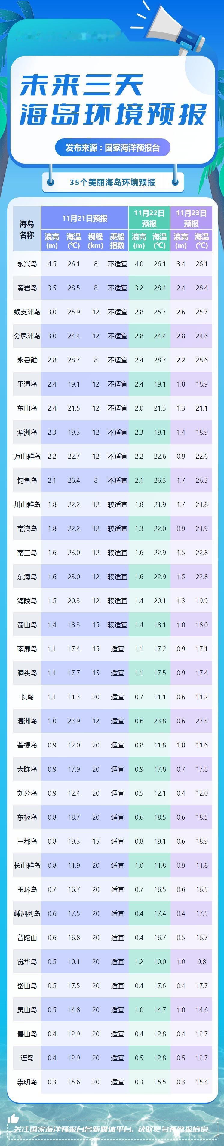 【海岛环境预报】今日发布35个美丽海岛未来三天环境预报。预计11月21日永兴岛附