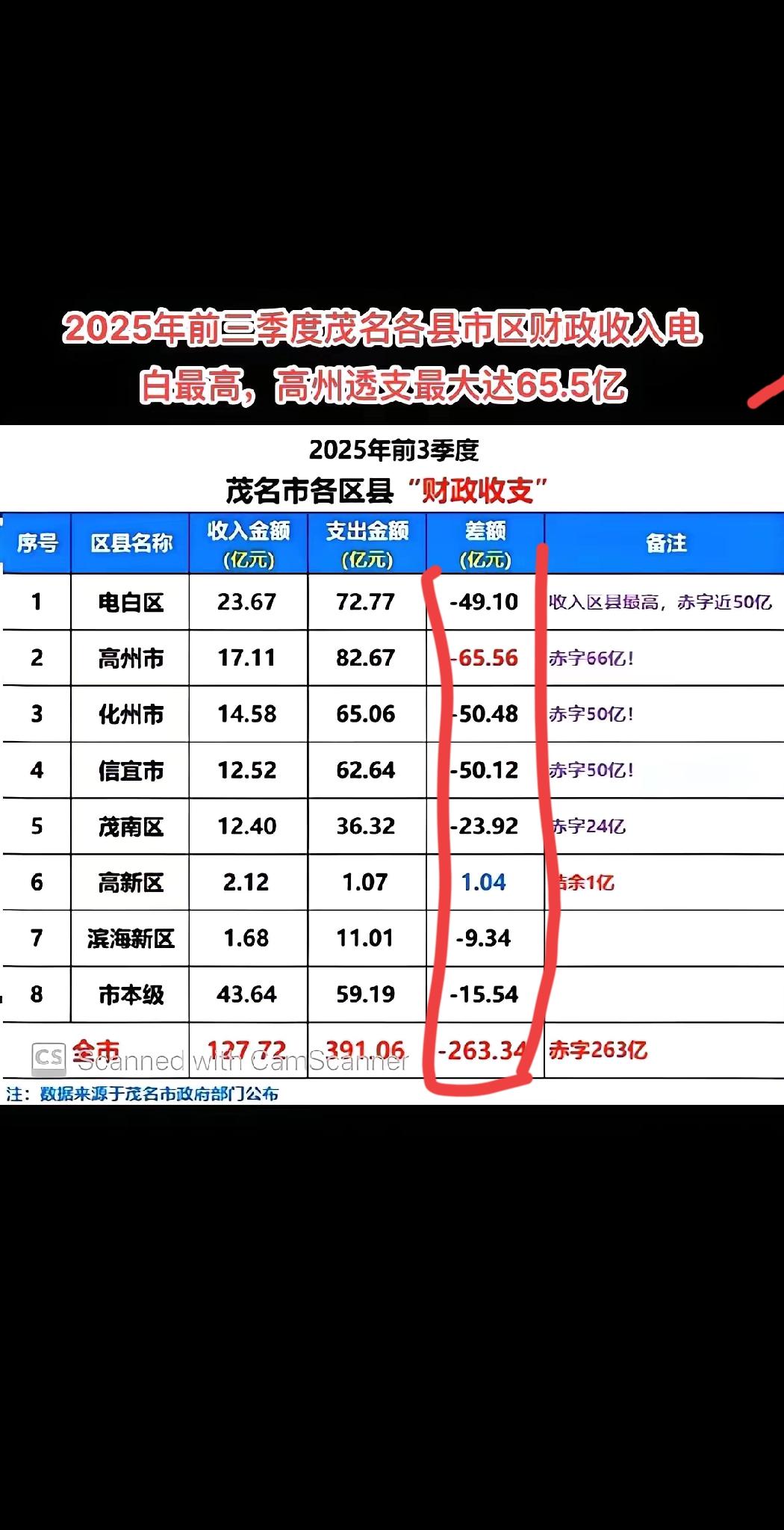 不懂就问大家,这算城市的负债吗? 这就是大家常说的入不敷出的地方负债吗? 2025年前三季度茂名地区高电化信等地的财政收入和财政支出数据显示,高州的财政支出数额最大。 这数据能否体现一个地区正因大兴土木工程,导致工程资金紧缺呢? 不过,我发现越是发达的城市,其债务往往也越高筑。 这或许也是城市大力发展工业、急需资金的一种体现!