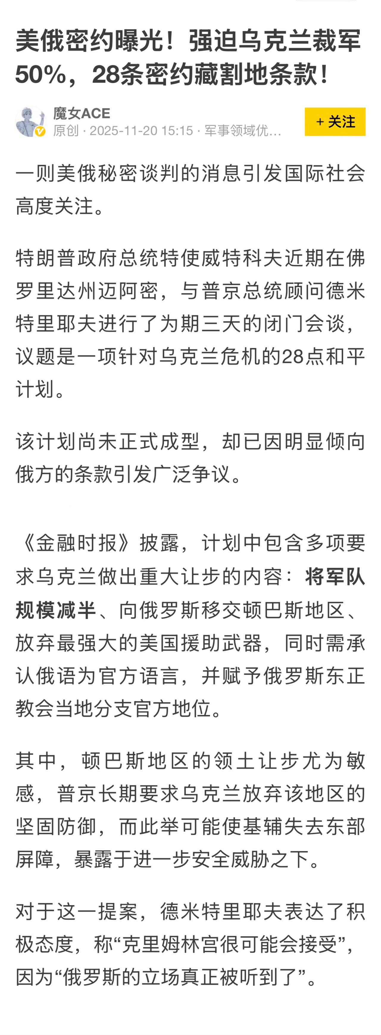 美国新和平方案,要乌克兰割地裁军? 欧盟外交部长卡拉斯在11月20日表示:任何可行的和平方案都必须有乌克兰和欧洲的参与,并指出了侵略者与受害者的区别,暗示俄罗斯并未展现出让步的意愿。