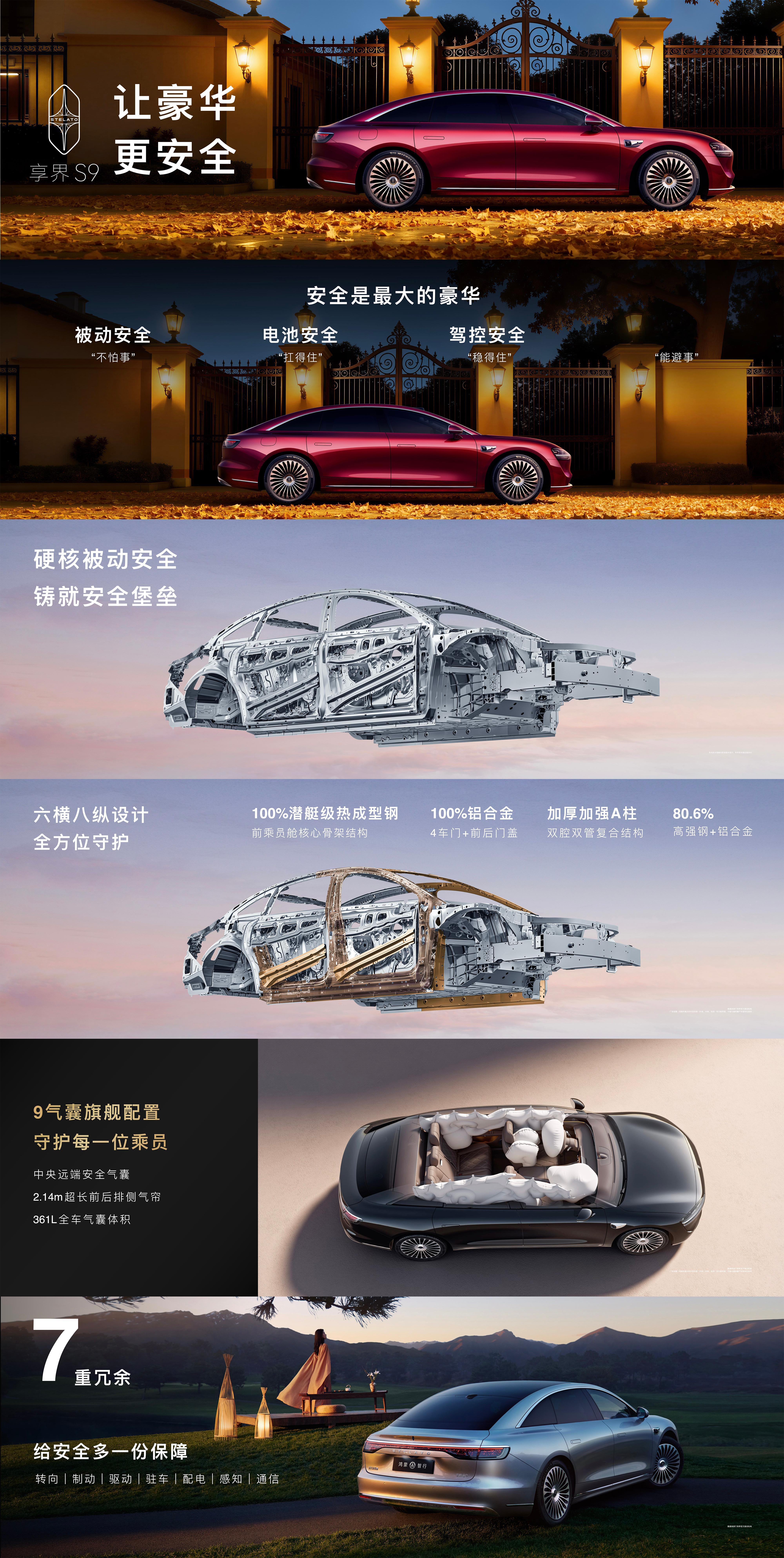 新款享界 S9 来了,这次把安全夯实到底之前咱就说过华为AEB强大到无需多言,口碑就是最好的证明!这次全新的S9采用六横八纵设计,标配9个安全气囊,被动安全超硬核;带来被动、电池、架控、主动四大安全。搭配华为巨鲸电池平台15层硬核安全保护。