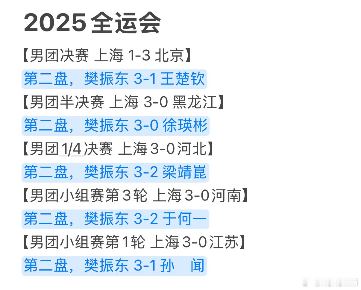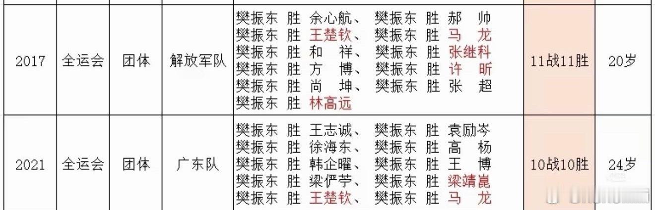 樊振东团体的神,辛苦了!2013 年团体 5 战 3 胜。16 岁。2017年团体11战11胜,6轮比赛5场一单两分。2021年团体10战10胜,6轮比赛4场一单两分。2025年全运会团体10战10胜!双杀世排一王楚钦。