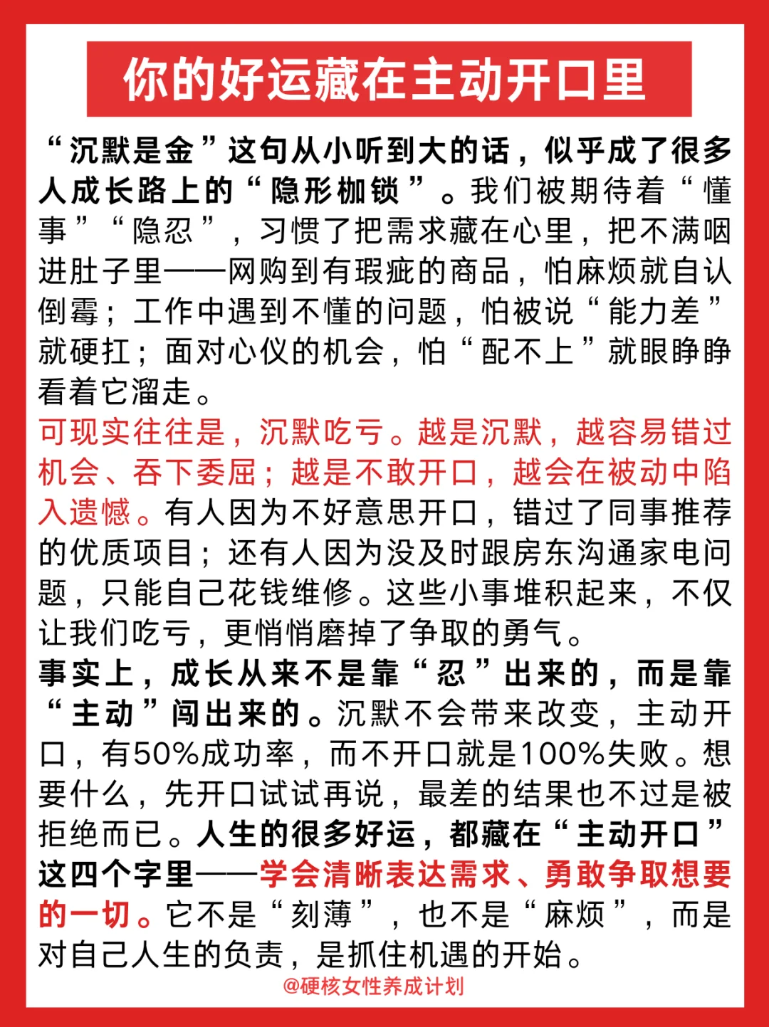 我以前也觉得“沉默是金”,多开口就是麻烦别人,结果吃了不少暗亏。直到后来试着主动开口,才发现:原来很多好事,真的是“要”来的。