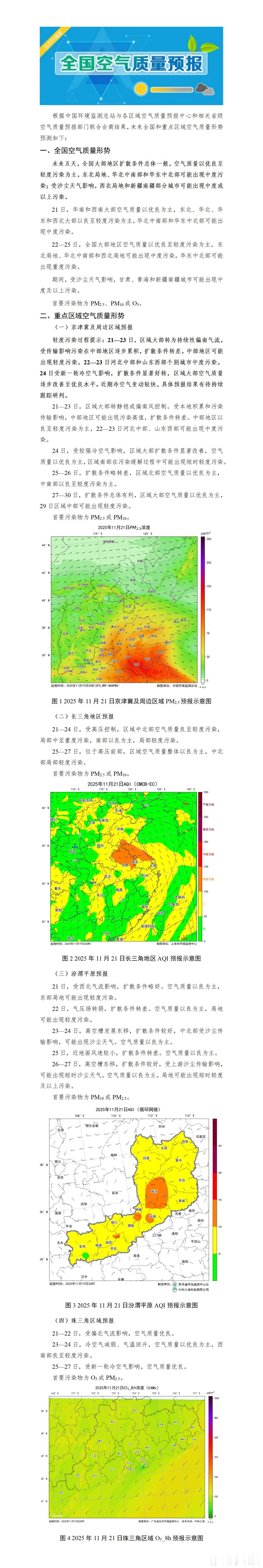 未来五天,全国大部地区扩散条件总体一般,空气质量以优良至轻度污染为主,东北局地、华北中南部和华东中北部可能出现中度污染;受沙尘天气影响,西北局地和新疆南疆部分城市可能出现中度或以上污染。