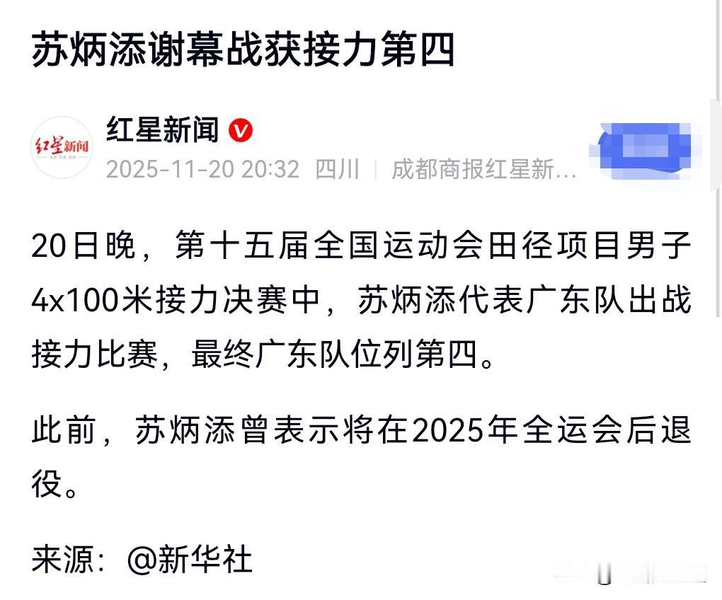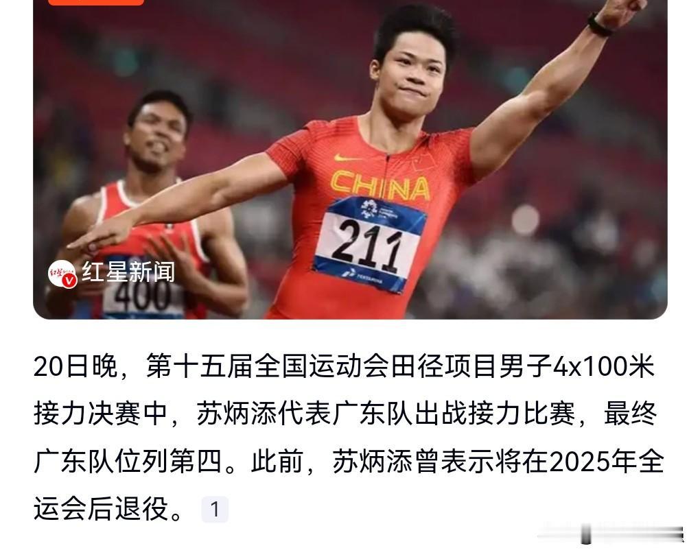 人生中处处充满着遗憾,哪能尽如人意。 11月20日消息,苏炳添谢幕战获接力第四。 此前他说会在全运会后退役。 这个成绩不算太好,虽然不太圆满。 但苏炳添的运动生涯还是很精彩的,应该没什么遗憾。 年纪不小了,要退役也是正常的。