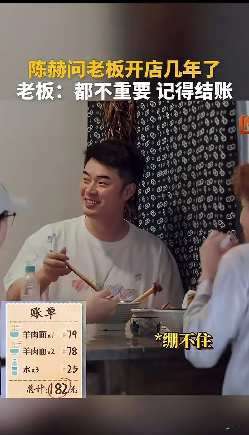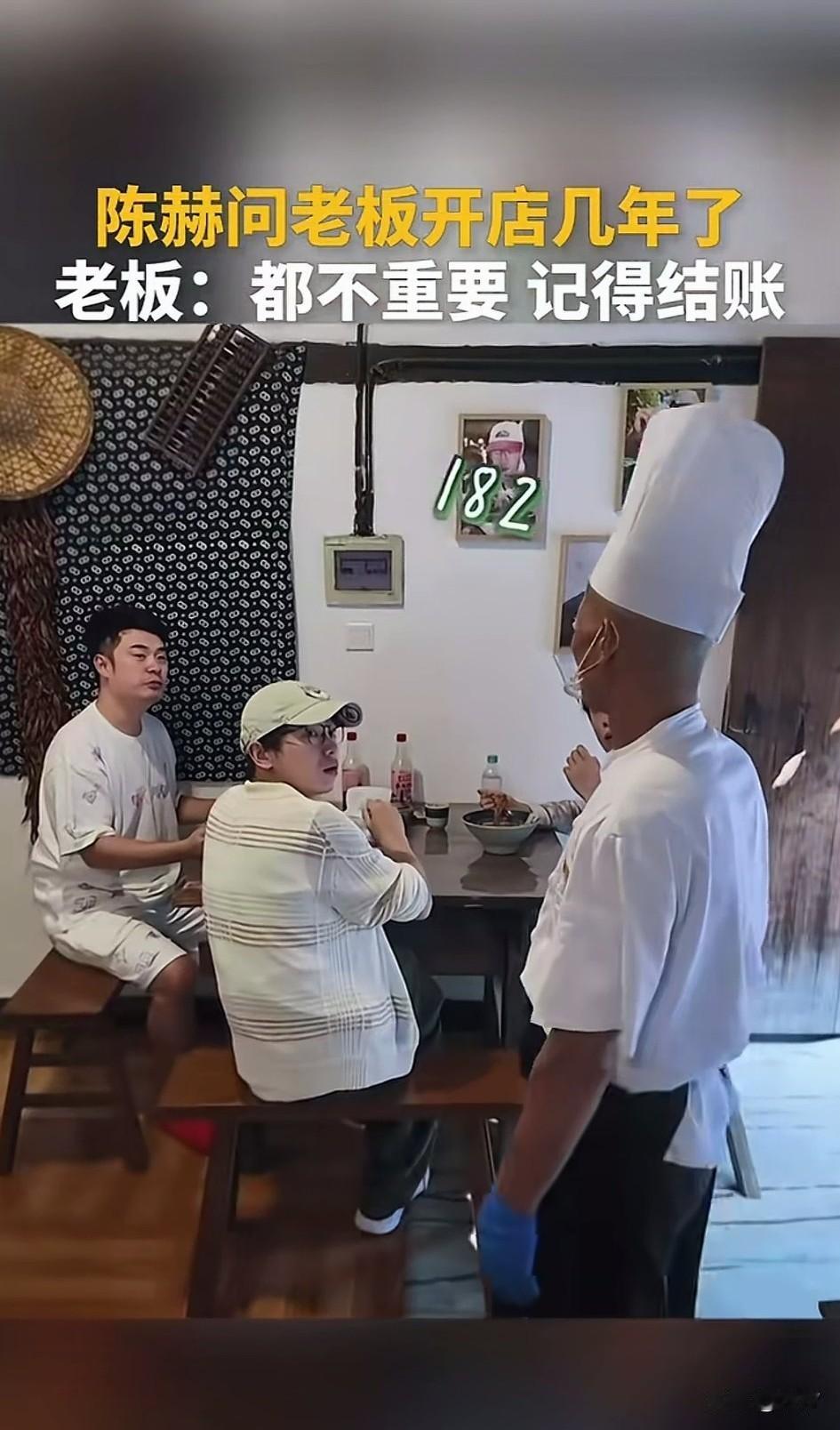 陈赫做节目去饭馆吃饭, 可能觉得自己比较红, 就和老板搭讪套近乎, 这样显得自己比较平易近人, 问老板开多少年了? 老板只回答了182, 陈赫不可置信, 问老板饭馆开了一百多年了, 老板可能没有听见, 也可能装作听不见, 又重复了一下他们的菜单, 羊肉面和三瓶水, 一共182元, 陈赫这才反应过来, 老板是提醒他们不要忘了结账, 这可把他逗乐了, 估计这老板平时不看综艺, 所以不认识他, 盛世把明星捧得老高了, 但并不是所有人都认识你, 大家对于陈赫这次饭馆吃饭被老板提醒付账怎么看? 陈赫 陈赫情商 陈赫生日聚会 陈赫穿搭 陈赫生日照