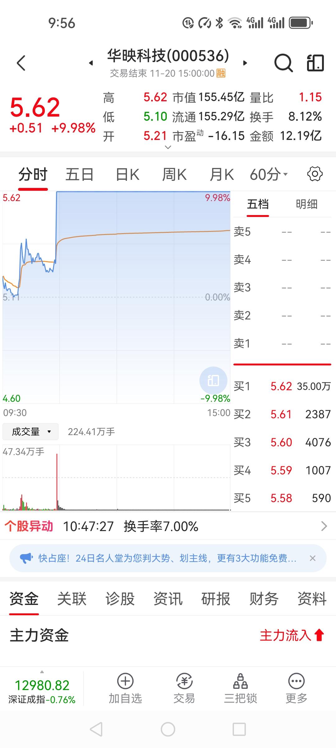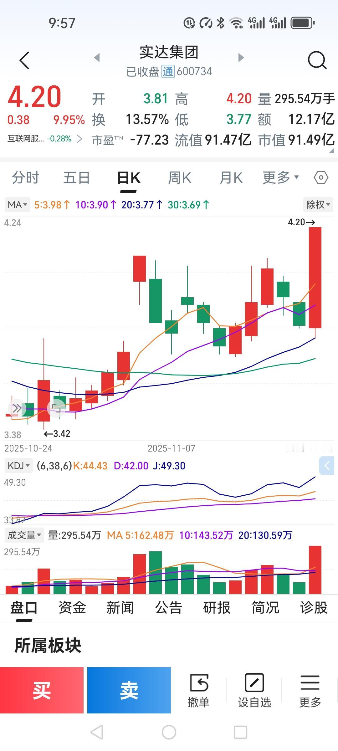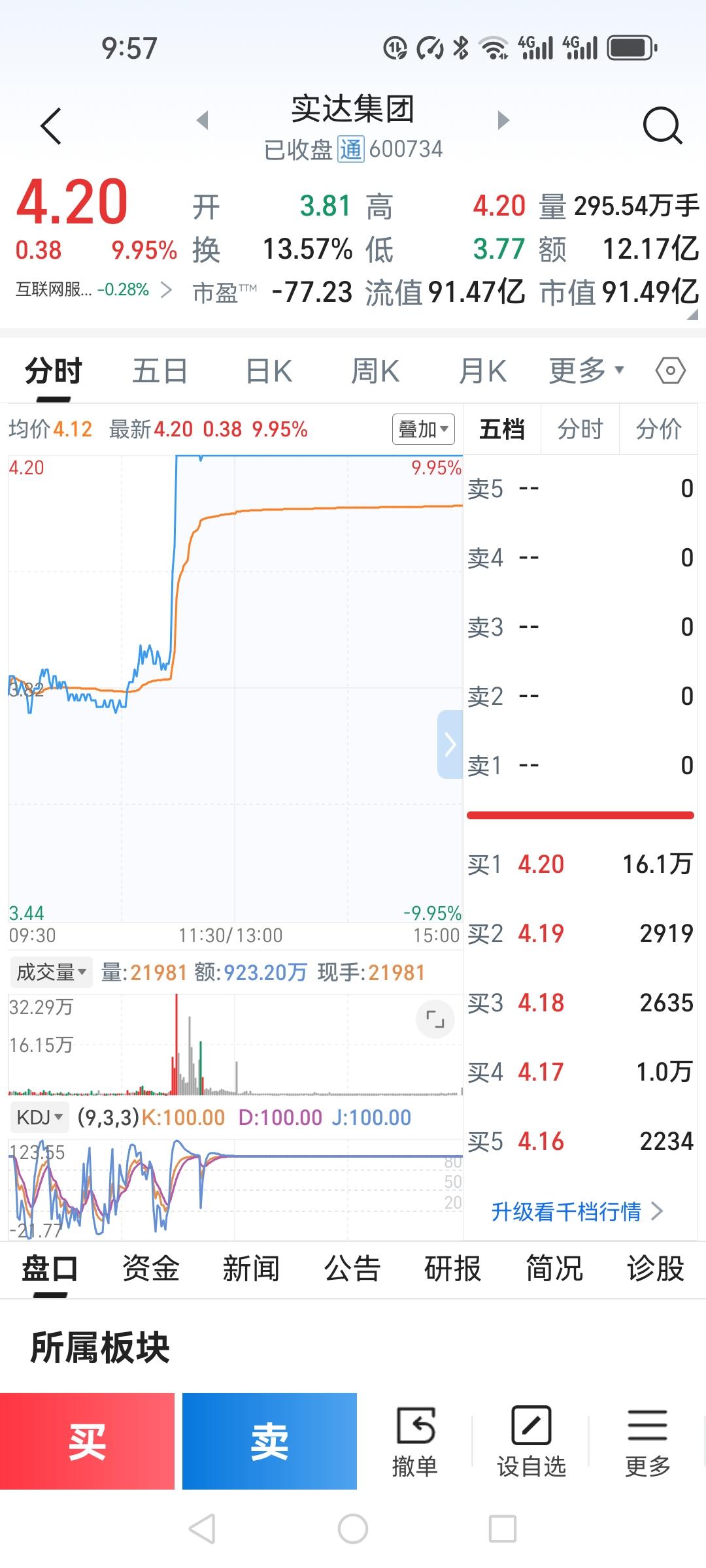 今天我有两只股票涨停,太出乎我的意料了。 实达集团我在上次涨停板4.09时当天