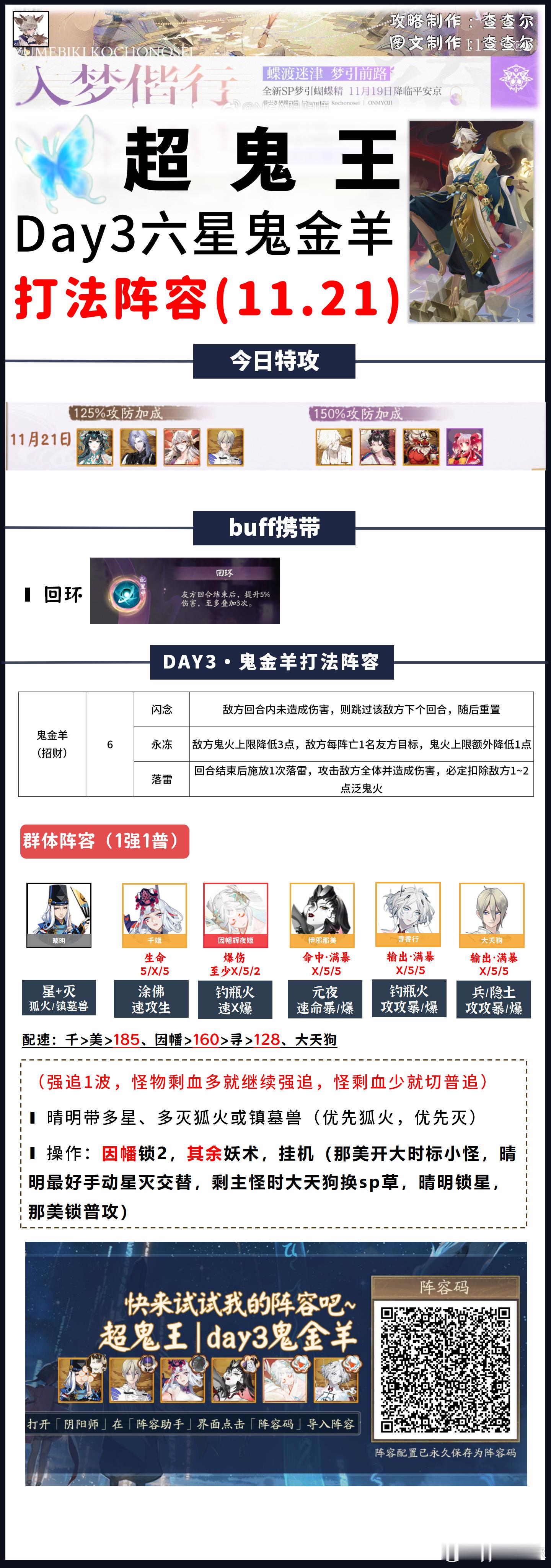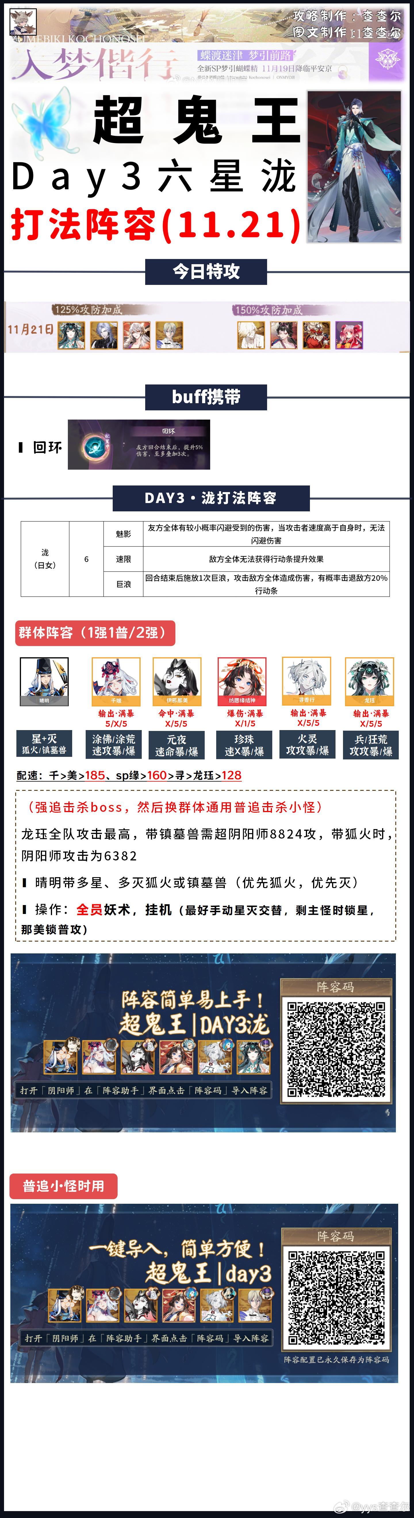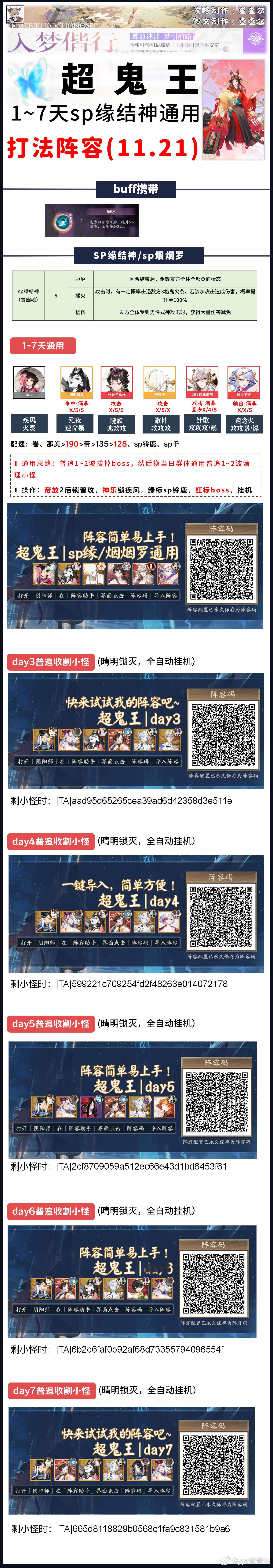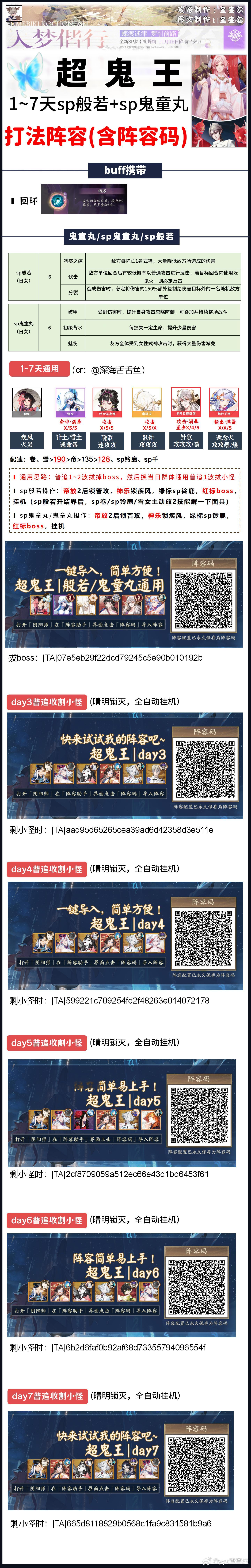 【超鬼王】dya3全鬼王阵容+阵容码一键配■来晚啦,不好意思大家,反复检查了好几遍。今日新增sp童/sp般若、sp缘7日通用阵容,已变白名单■day3群体通用(5/6星收割小怪用它):|TA|aad95d65265cea39ad6d42358d3e511e■1~4星:|TA|12cc3a325c1e256efd7744066136331■5星+部分6星通用:①鬼童丸/sp鬼童丸/sp般若:|TA|07e5eb29f22dcd79245c5e90b010192b②sp九命猫/伊邪那美:|TA|12cc3a325c1e256efd77440661363312③sp烟烟罗/sp缘结神:|TA|3480095f2bfeeedd895fe670179a22e2④sp灯/鬼金羊:|TA|834b9fc6a52e3ea0e3e6d6f45cb194dd⑤封阳君/山风:|TA|1eb6dda7238c51ce3ede11810054a404⑥sp荒川/彼岸花/泷:|TA|e0e5da4755af52d1f378f34bfdd441cd⑦御馔津:|TA|dfed572710342c8b2b5640d43cca76ad⑧铃彦姬:|TA|3e75f53951b04fdc00f9d0d233f8ddff⑨荒骷髅:|TA|9a45a988af5c0f2be6f389188a1bd59a■6星:那美/月读/睡猪/山兔:|TA|12cc3a325c1e256efd77440661363312sp不见岳:|TA|4da42f197b91b7b3e6efcbc11ae36fa8平将门:|TA|5deedbb0b426992d3b863e0ad9d370d1因超鬼王工作量巨大,如有配置失误还请大家多多包涵,感谢大家支持(有配错的我及时更正)