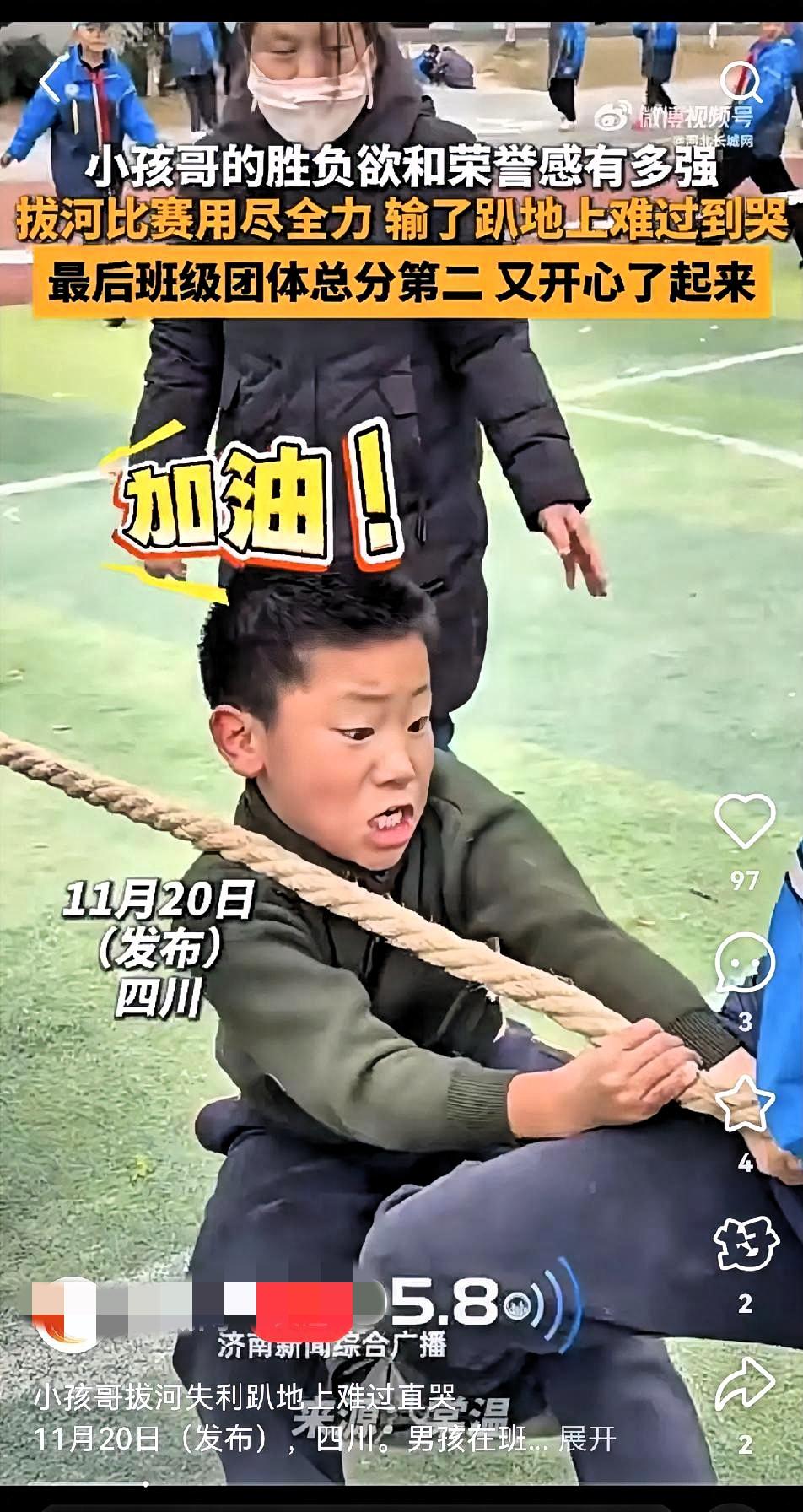 笑不活!四川小学拔河赛“名场面”:小孩哥拼到力竭输了,躺地爆哭喊“没作业也哄不好”! 11月19日,在四川泸州某小学举行的一场拔河比赛中,一名男孩拼尽全力拉扯绳子,但最终输掉比赛,躺在地上哭了起来。 小孩哥的胜负欲和荣誉感有多强拔河比赛,用尽全力输了趴地上难过到哭。最后班级团体总分第二 ~又开心了起来! 一名老师拍下了视频,并发到了网上。 视频中可以看到,这名男孩在比赛中使出了全力,脸都憋红了,赛后他的情绪直接崩溃了,随后躺在地上,扬起头嚎啕大哭。 记者了解到,这名男孩哭泣是因为不甘心,“就算今天没有作业,也哄不好。” 谁羡慕了?小孩哥为拔河输赢哭得撕心裂肺,这份为热爱不计后果的投入、不藏不掖的情绪,正是成年人渐渐丢失的纯粹,这样的热血童年太真实! 网友们看到视频后纷纷表示:“一生要强的男人,一生都要赢!”“可惜他还是输了,一辈子要强也难赢。”“要强又怎样,要强也会哭。” 这份为热爱拼尽全力、输了就放声哭的纯粹,谁看了不怀念?你小时候有没有为某件事拼到崩溃大哭?现在失意时,还敢这样尽情释放情绪吗?来评论区聊聊~