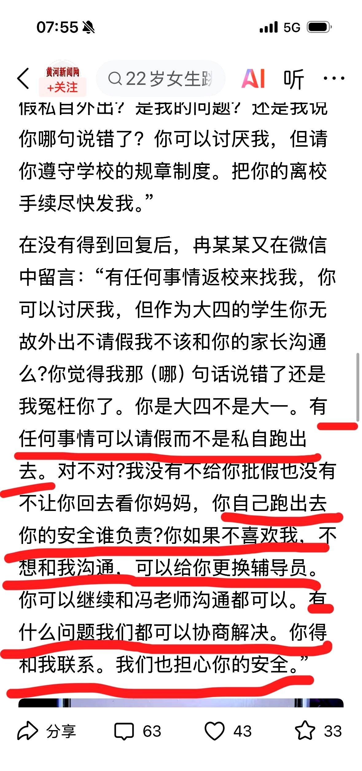 一名大学生未请假私自离校回家,辅导员微信上和女同学“争执”,女生返校路上自杀。 家长指责学校索赔。 争执是老师要求履行请假手续。 自杀原因绝非所谓“争执”。 你把孩子交给学校,学校有义务负责同学的安全,同学在校期间的去向,学校必须知情,所以,辅导员要求学生离校请假是知晓去向的重要途径,辅导员的要求无不妥之处,学生的死与学校和辅导员毫无关系。 如果学生擅自离校外出发生意外,家长又责怪学校没有尽到监管责任,家长不同样要追责学校和辅导员吗? 我女儿大学也严,节假日晚到校,要父母填表,附上父母身份证在表上拍照上传过去。 这是辅导员认真负责,如果不理不睬,辅导员起码脱一层皮。 今年,我外甥女上大学,和我一个城市,周末会回我这边,请假要和辅导员微信告知的,第一次是打的电话,确认每次回来都要请假,多聊了几句,人家就是为了孩子安全,害怕在校外出问题。 请假就批,根本不会为难人。