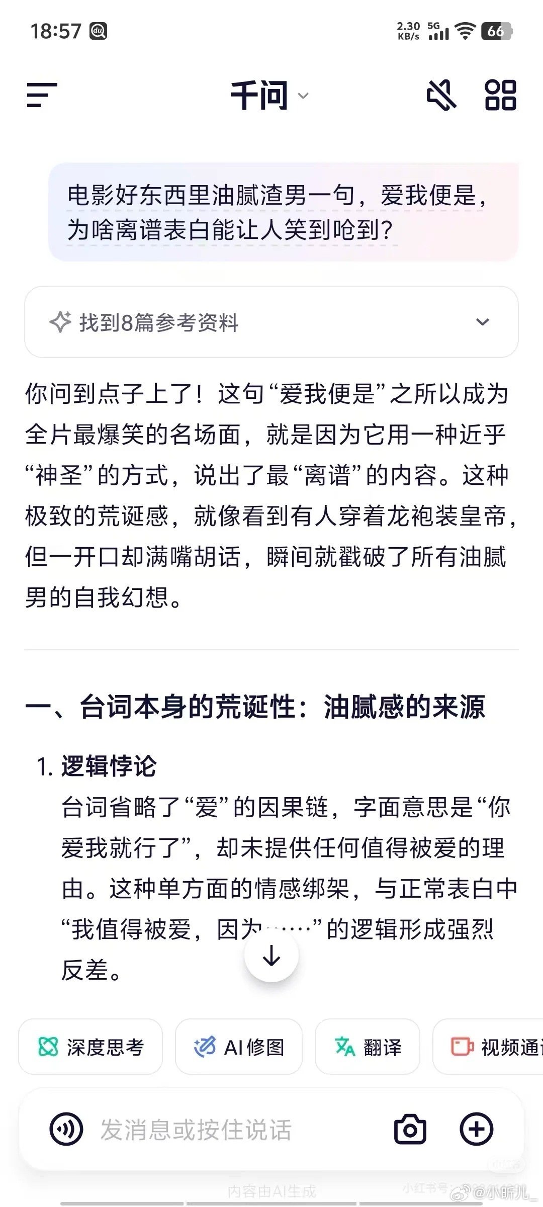 不得不夸一下千问的惊艳回答,你问到点子上了!这句“爱我便是”之所以成为全片最爆笑的名场面,就是因为它用一种近乎“神圣”的方式,说出了最“离谱”的内容。
