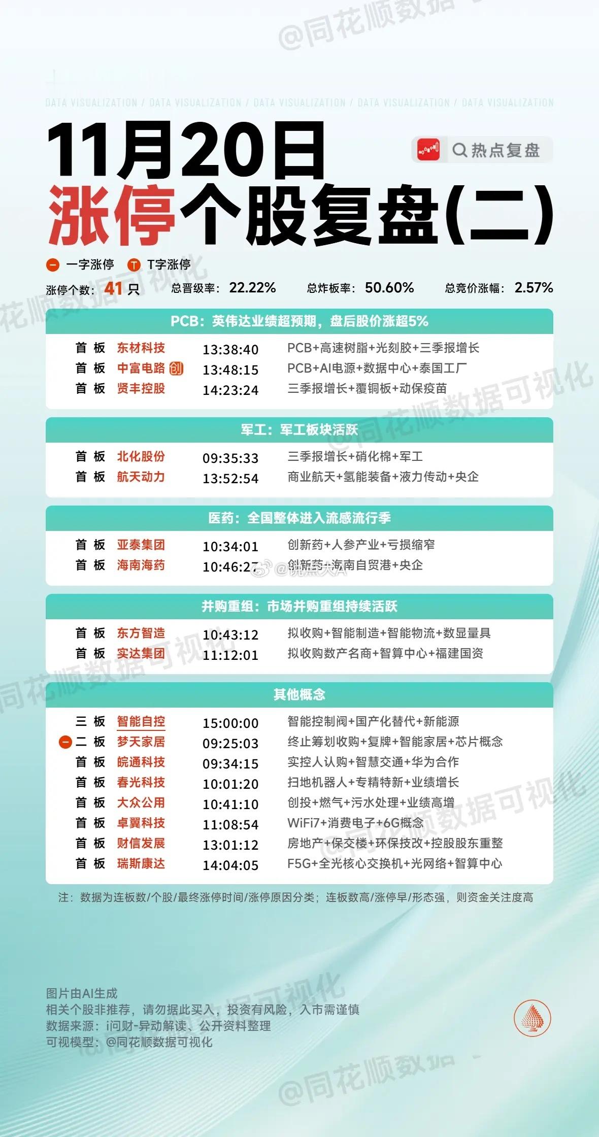 11月20日复盘:合富中国、航天发展、九牧王、大为股份、榕基软件隔日走势的一些看法!1、合富中国(海峡两岸)合富竞价最终是平盘开,这样的表现其实算是比较强势的,再加上早盘九牧王弱转强超预期,这对于短线情绪是非常友好的,所以开盘后合富是有明显的拉升,但是这只个股毕竟停牌前是一个炸板走势,所以盘中的分歧抛压非常大,好在始终有资金在高位承接横盘,在量能释放的差不多时有资金去强势封板,但是午后受到九牧王持续下杀负反馈的影响出现开板,好在一直有资金承接,在反复几次后还是彻底封死涨停!合富今天的表现是非常强势的,对于短线情绪的修复起到了很好的引导作用,而且今天是走出了明显的趋势上行有强支撑的走势,合富昨天是进了重点监控名单的,它有如此表现是超强的,最终今天这个涨停量能释放的也比较适中,那么隔日冲高会是大概率的,而且明天平潭复牌,从今天合富的表现看,隔日资金的态度可能会偏乐观,这样的话,合富或许会有共振继续强势的表现,但是一旦竞价偏弱,那么可能就会一起兑现了!2、航天发展(海峡两岸+军工)航天竞价一字板的表现是非常强势的,但是开盘后军工方向是明显下杀的负反馈,所以航天也是大幅下杀的表现,盘中一度杀到水下出现了强承接拉升,之后持续在分时均线位置震荡,尾盘受到九牧王拉升的情绪影响带动,走出了比较强势的回封走势,虽然在板上依然有分歧抛压,但是最终还是彻底封死涨停,走出了一个高位放量T字板!盘后的龙虎榜陈小群继续加仓,买盘还有两个机构,卖盘获利游资大部分止盈离场,这个榜单是非常漂亮的,短线多数游资在这个位置选择兑现,毕竟航天流通盘已经超过了2百亿,近期量能持续萎缩的情况下其实很难支撑连板的,但是情绪因素在,它最终还是走出来了,隔日就大概率依然能够给到溢价,航天今天的实际换手是达到了55%的,这算是非常大的了,再结合今天航天的形态和市值,隔日断板几乎是铁定的!3、九牧王(海峡两岸)九牧王竞价超预期高开7个点,所以开盘后是有资金强承接去封板的,反复几次后彻底封死涨停,但是没有持续几分钟,出现了资金大幅抢跑兑现,并且很快下杀到水下,午后一度封死跌停,但是很快出现资金超强承接拉升完成地天板,最终走出了一个超强的天地天走势!盘后的龙虎榜买盘除了近良路是早盘顶板买入的资金,其余上榜资金都是下杀的抄底资金,卖盘多为获利盘止盈,值得一提的是小群并没有止盈离场,这样的榜单算是一个良性的换手,这个天地天跟之前的安泰很类似,但是个股的地位却是差距明显,毫无疑问九牧王是市场最高标,再加上它竞价是有绝对强势的表现,而且它尾盘的地天对于市场短线有非常强的带动作用,这些都是安泰不能比的,所以隔日它虽然有预期差,但是不排除它依然能够走出冲高表现,毕竟隔日平潭复牌,它或许依然会有弱转强的机会,毕竟今天合富复牌,它已经走出了一次弱转强,隔日如果再来一次也不是不可能!4、大为股份(锂矿+芯片)大为竞价近5个点的表现还是非常不错的,盘中杀跌承接换手后很快出现资金拉升强势封板,在板上释放了一定分歧后彻底封死涨停!盘后的龙虎榜买盘依然有两个机构,同时还吸引来了江苏路和深圳前海两个席位入场接力,卖盘是昨天买入的4个机构和西大街这个量化,大为这算是一个比较良性的换手,今天锂电多数个股最终走出了冲高兑现的走势,这对于大为来说肯定会有一定影响,但是毕竟今天它这个涨停还是比较强势的,隔日大幅冲高是有保证的,从形态上看,它有模仿天际的走势,所以隔日它的预期依然还在,如果竞价依然有强势表现,特别是它另外一个强势概念芯片有止跌趋势,它或许能够继续走出来,这只个股不好的点是股价太高,在这个位置确实很难炒作成特别高的高度!5、榕基软件(AI应用+海峡两岸)榕基竞价是明显的弱转强,而且相比于同身位的浪潮,是有比较明显的卡位倾向,再加上它海峡方向的属性,开盘后资金的选择也明显是榕基,所以它很快出现强势承接迅速封死涨停,走出了一个名字的缩量连板!盘后的龙虎榜是3日榜,买盘游资和量化齐聚,卖盘新闸路兑现离场明显,其余卖盘也多为近期获利盘,这是一个非常不错的资金换手榜,再加上今天榕基是高标中形态最好的,隔日得预期就非常高,特别是华胜的趋势还在,整个AI整体可能依然有预期,所以它隔日继续转强走一字的概率非常大,而且它不管是流通市值还是股价以及板块都是现阶段比较容易走成妖股的形态,所以榕基隔日得表现还是可以高看一眼的!文中的内容仅为分享和交流,不作为实际操作建议!