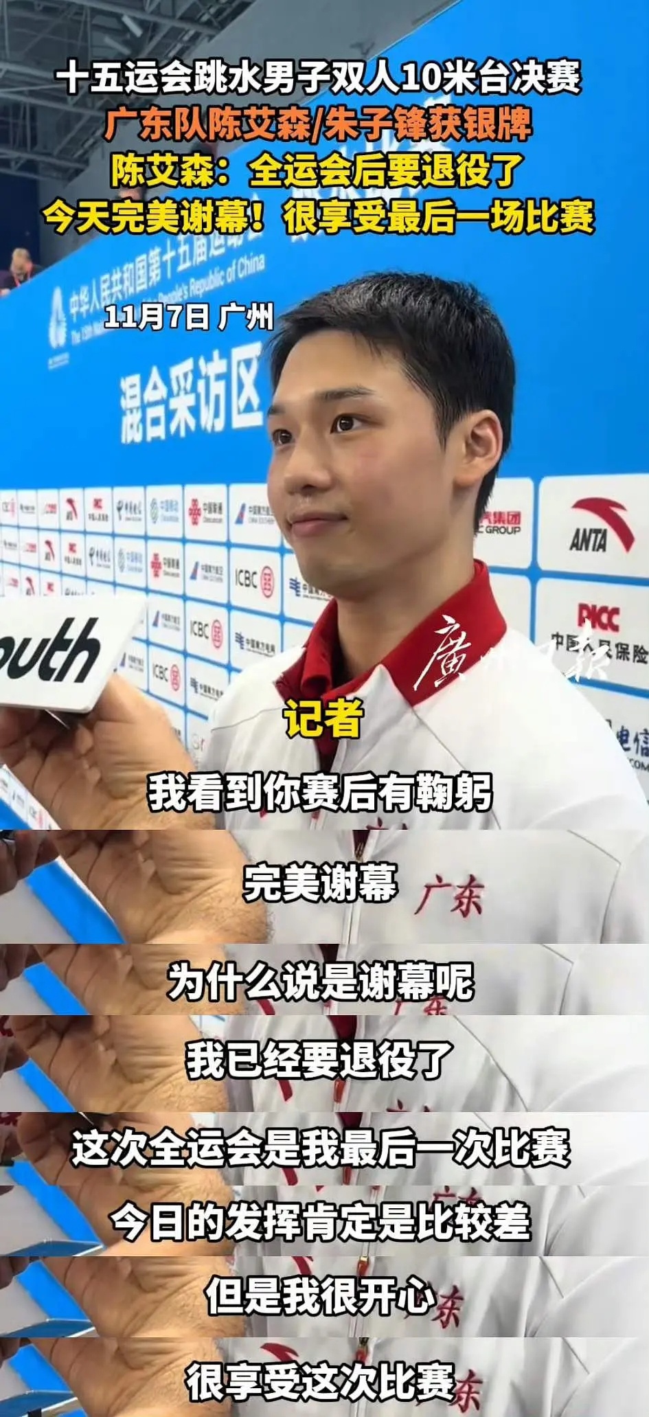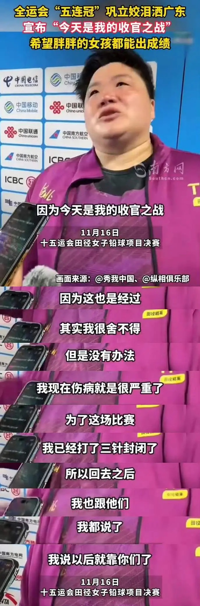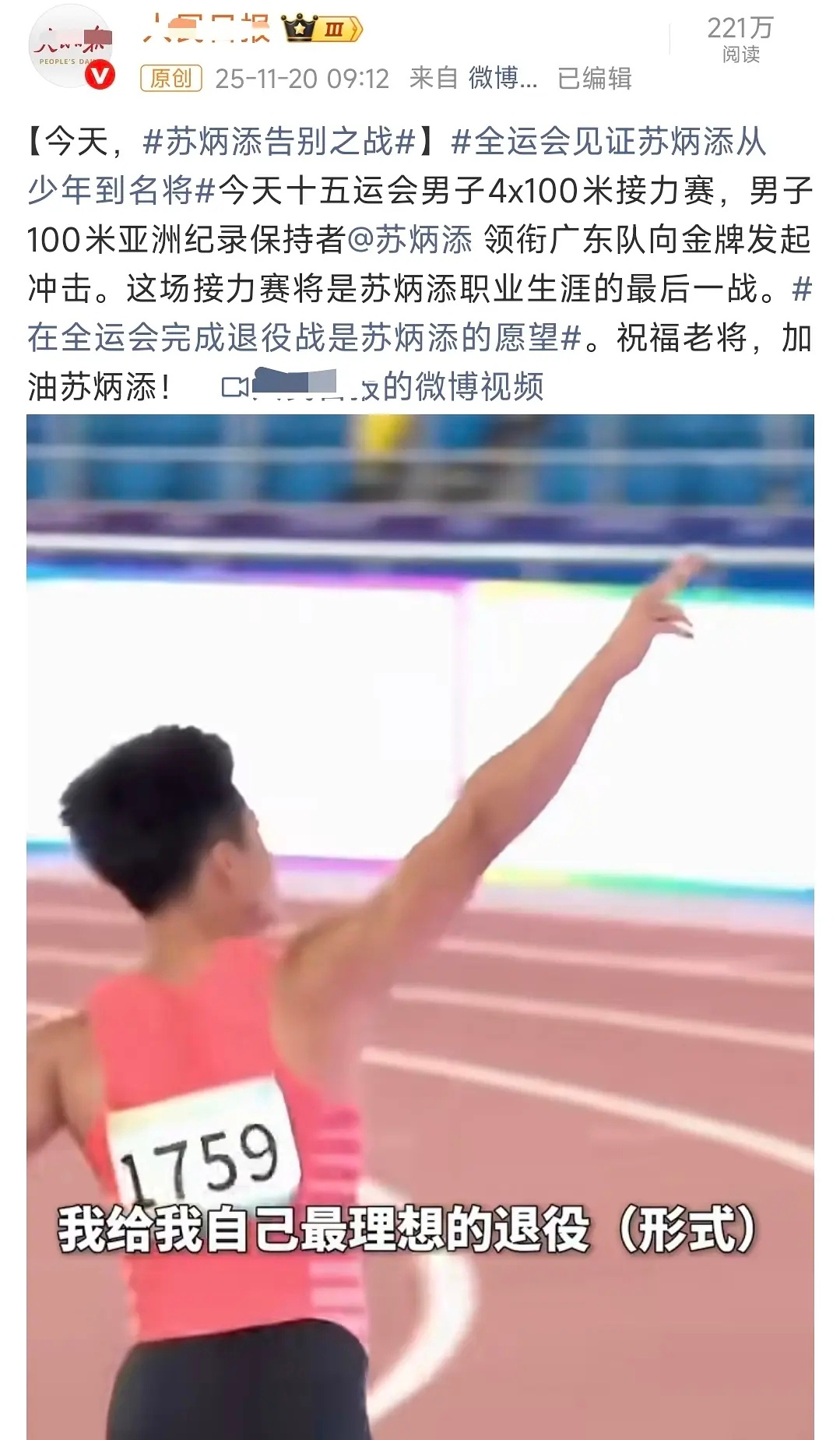 这次全运会是苏炳添的告别之战了……这次还有很多优秀的运动员退役了,看到他们哭着说是最后一次了,我也很难过……希望运动员们以后都变得更好