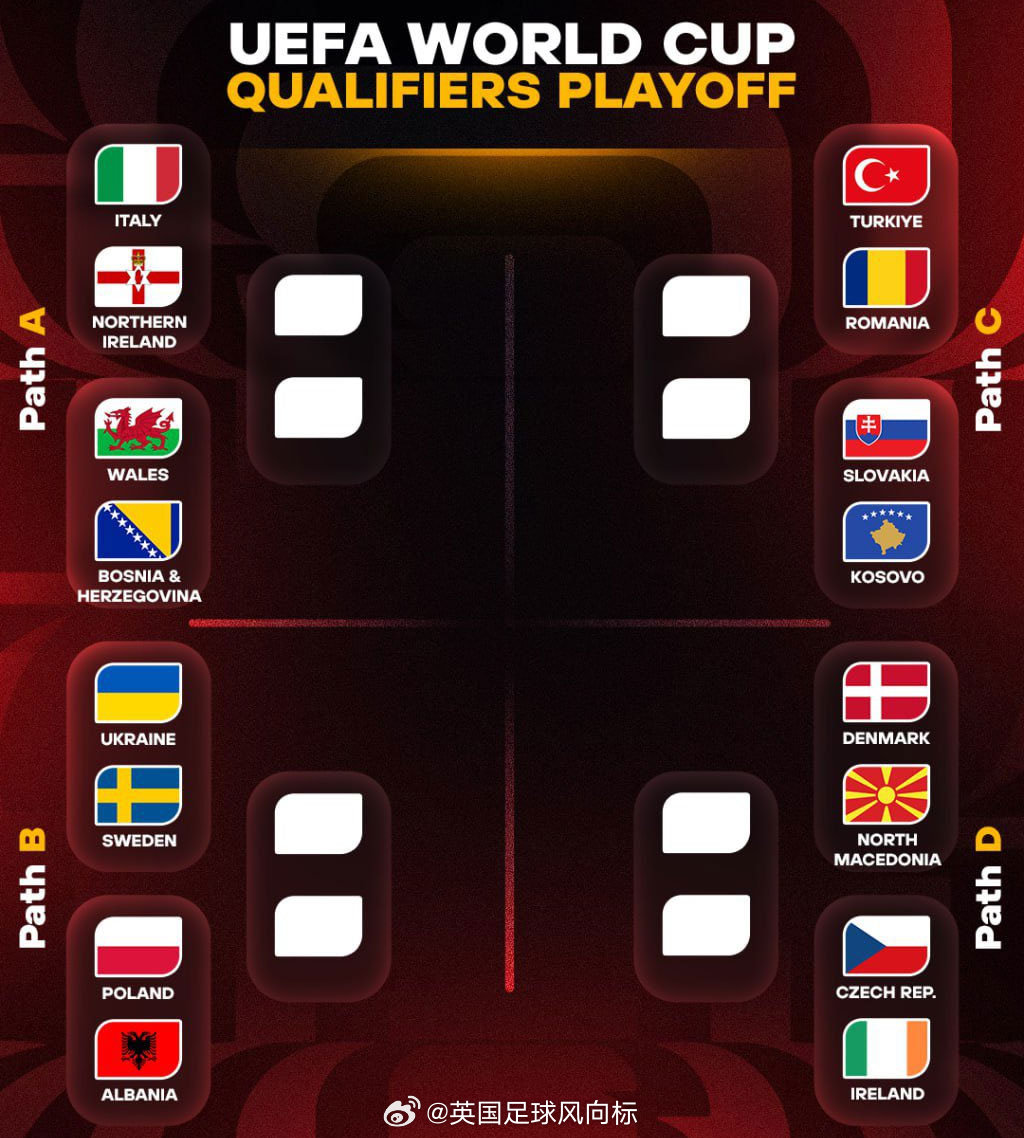 【意大利上签?】结果出炉,意大利对阵北爱尔兰,瑞典对阵乌克兰:A区:意大利vs北爱尔兰,威尔士vs波黑(胜方决赛主场)B区:波兰vs阿尔巴尼亚,乌克兰vs瑞典(胜方决赛主场)C区:土耳其vs罗马尼亚,斯洛伐克vs科索沃(胜方决赛主场)D区:丹麦vs北马其顿,捷克vs爱尔兰(胜方决赛主场)懒人包:每个区,半决赛和决赛都是单回合制。半决赛队名在前为拥有主场之利,决赛则后一对碰的胜方拥有主场之处,每个区的冠军晋级世界杯。举例,半决赛意大利主场对阵北爱尔兰,如果意大利赢了,决赛将要作客威尔士与波黑胜方。
