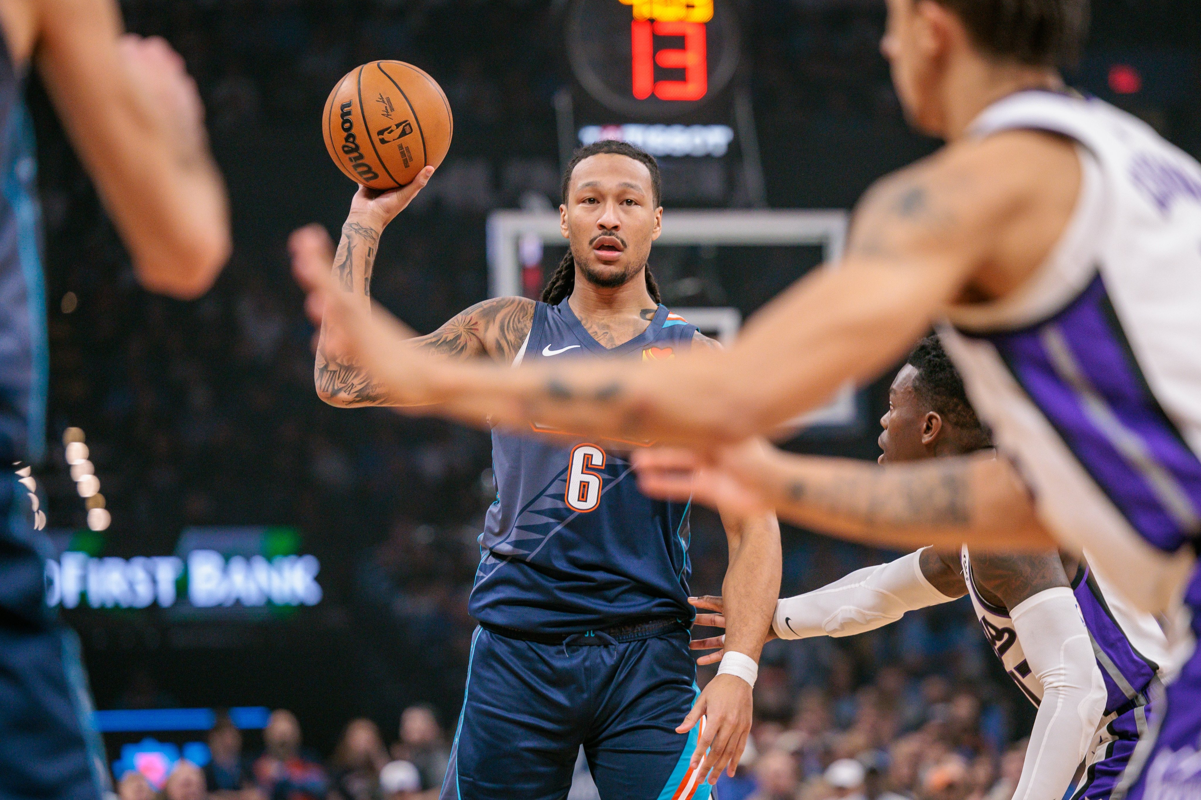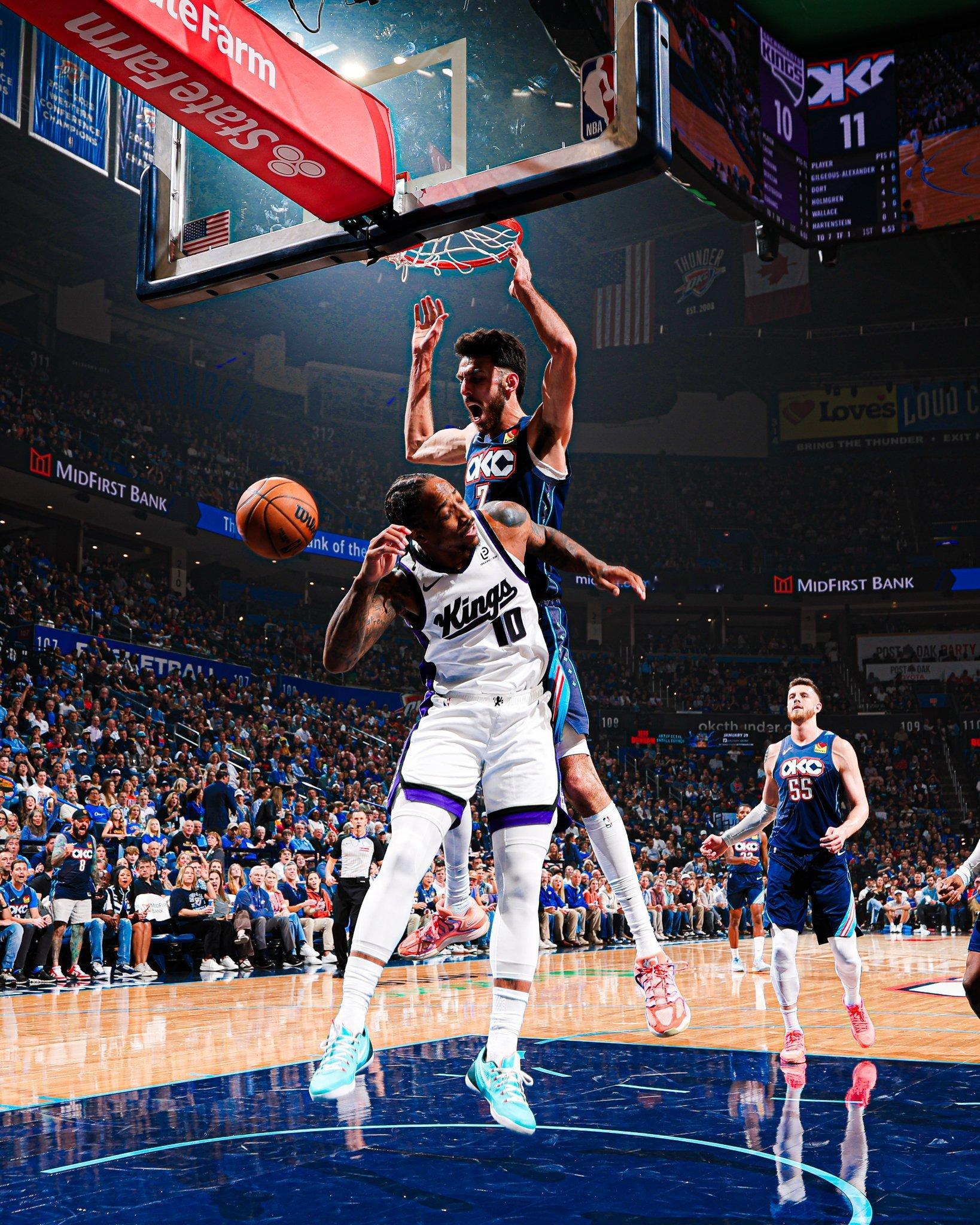 雷霆vs国王的比赛即将开始,马戴派出的首发是:亚历山大、卡森华莱士、多尔特、切特