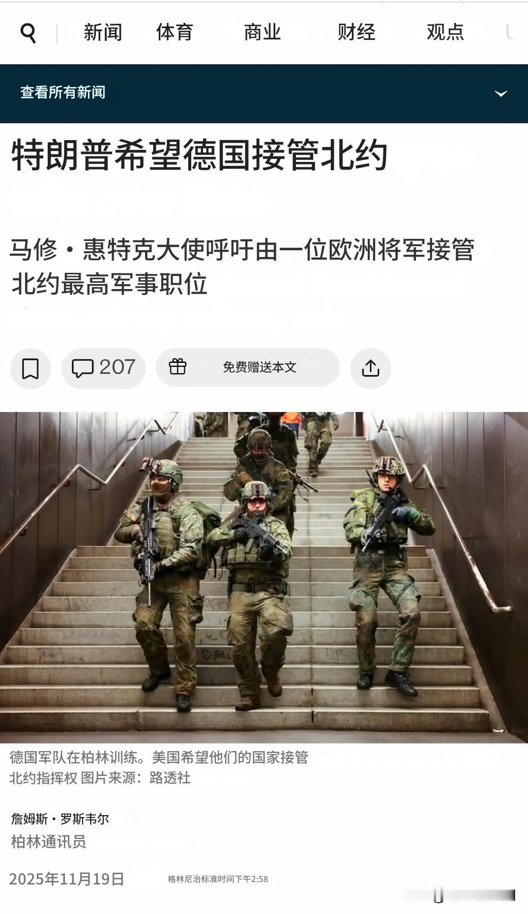 2025年11月19日,在柏林安全会议上,特朗普任命的北约大使马修·惠特克(Matthew Whitaker)公开表示:美国希望德国接管北约欧洲盟军最高司令(SACEUR)职位。这个职位传统上一直由美国将军担任(现任是Alexus G. Grynkewich将军,于7月上任),是北约军事指挥体系中最关键的岗位之一,负责指挥北约在欧洲的所有作战部队。热点解读 惠特克同时强调,美国仍完全致力于北约,但希望欧洲国家(尤其是德国)承担更多责任,并称赞德国近年来大幅增加国防开支的努力。 德国方面反应谨慎:德国驻北约和欧盟代表沃尔夫冈·维恩中将当场表示“我对这个看法的理解有点不同”,强调德国愿意在北约内承担更多责任,但仍视SACEUR为美国的“关键责任”。 美国要求欧洲盟国大幅提高军费(从2%提高到5% GDP,德国已表示支持);推动欧洲“自己扛起更多担子”,减少美国单方面负担;用“让欧洲人领导欧洲防务”来回应国内“美国优先”的呼声,同时保留美国在北约整体上的主导地位(北约秘书长和政治决策仍以美国影响力最大)。
