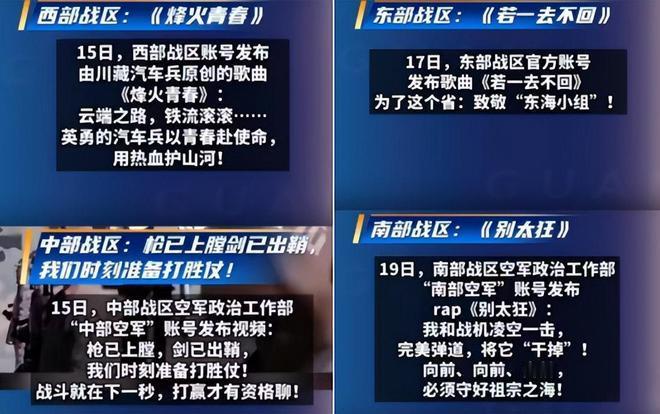 你知道大炮是用来做什么的吗?南部战区给出的答案是“丈量国土面积的”!最近,南部、东部、中部、西部四大战区官方账号相继发声,每一句都燃得让人热血沸腾。 南部战区以rap《别太狂》喊出“必须守好祖宗之海”;东部战区借歌曲《若一去不回》致敬“东海小组”;中部战区直言“枪已上膛剑已出鞘,时刻准备打胜仗”;西部战区则誓言“打败一切来犯之敌”。 从战机轰鸣到导弹发射,从铿锵战歌到硬核宣言,四大战区用行动诠释着守护家国的坚定决心。这样的强军姿态,让每个中国人安全感拉满,也让我们真切感受到:祖国的每一寸土地,都有最硬核的守护!