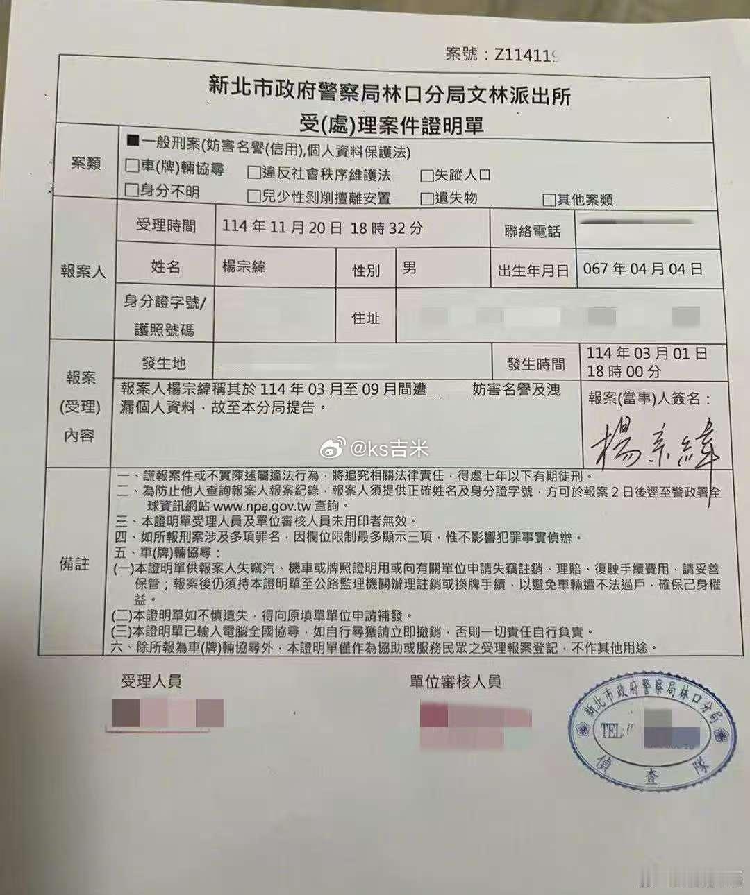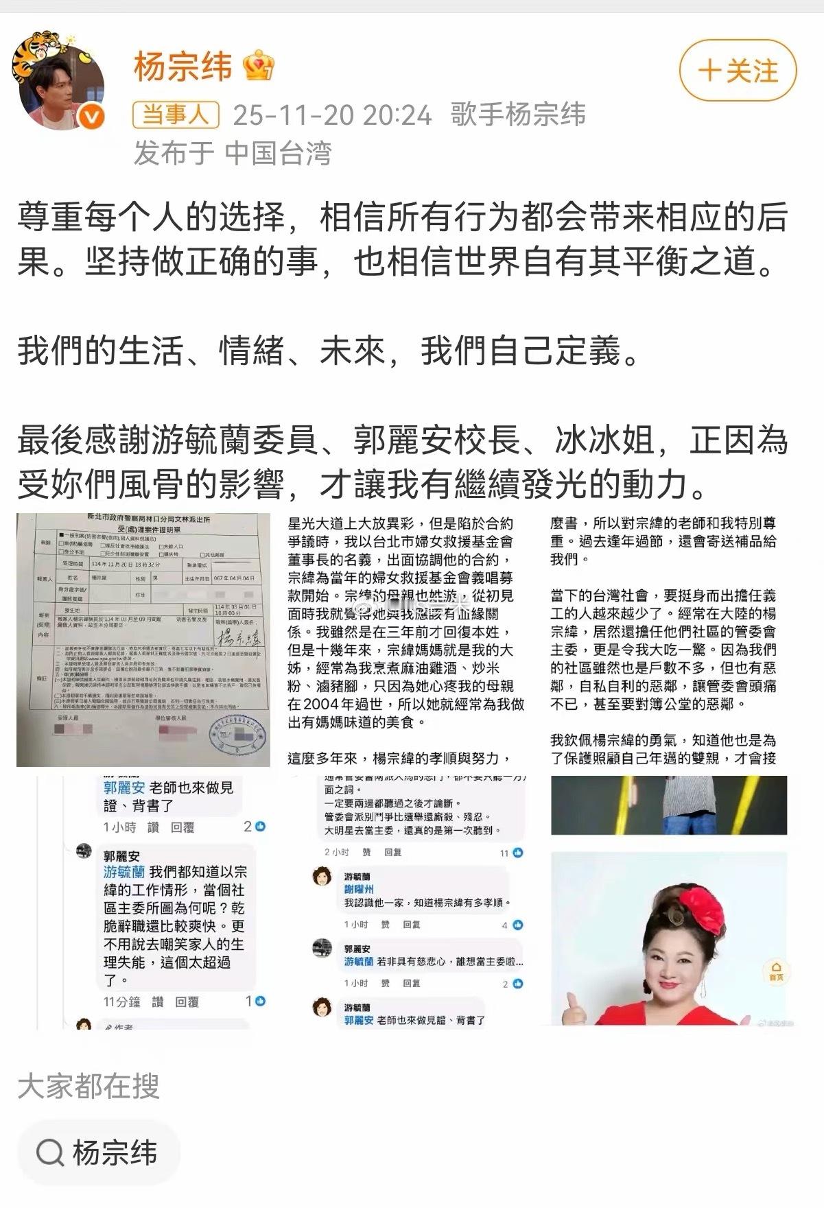 近日,杨宗纬被曝是恶邻引发热议。20日晚,杨宗纬晒出报案回执,并发文称:“尊重每个人的选择,相信所有行为都会带来相应的后果。”