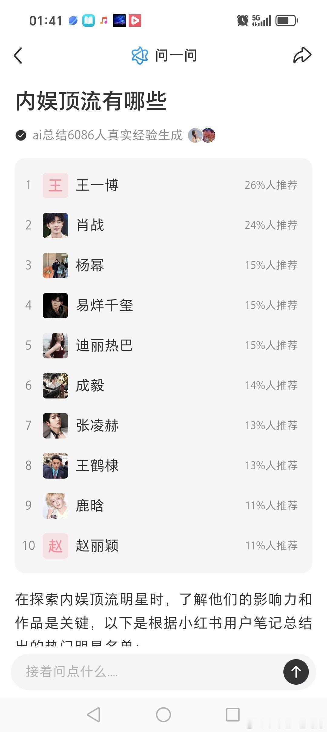 网友对内娱顶流是谁发起了投票,按照投票排名是:王一博、肖战、杨幂、易烊千玺、迪丽热巴、成毅、张凌赫、王鹤棣、鹿晗、赵丽颖