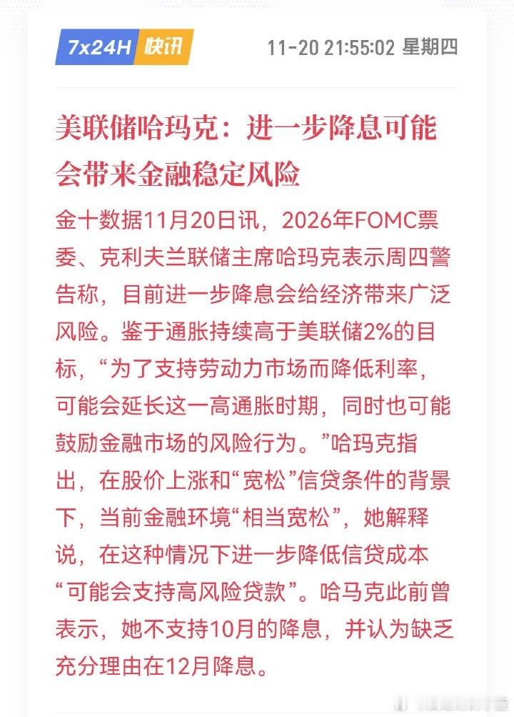 美联储哈玛克:进一步降息可能会带来金融稳定风险。