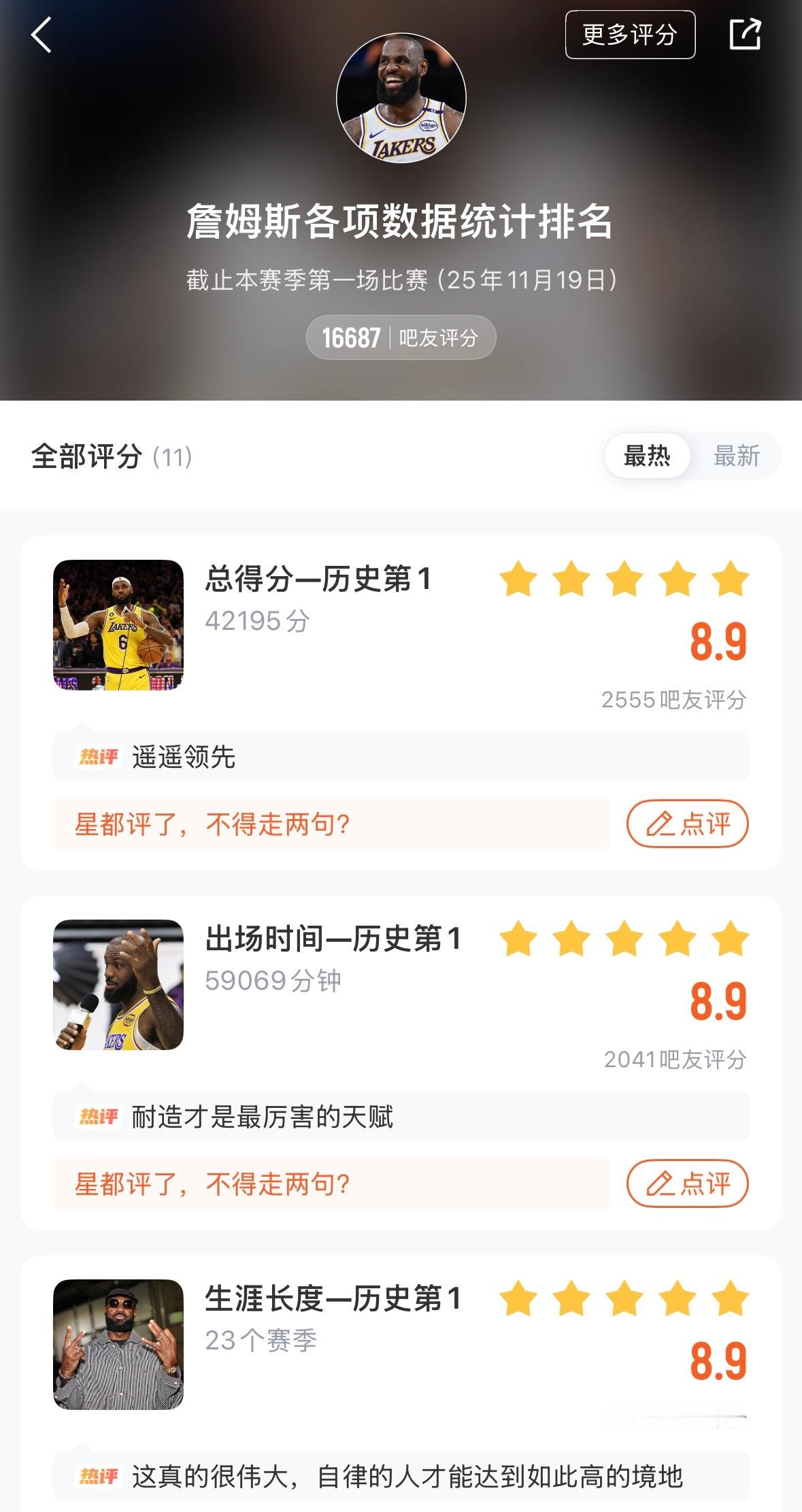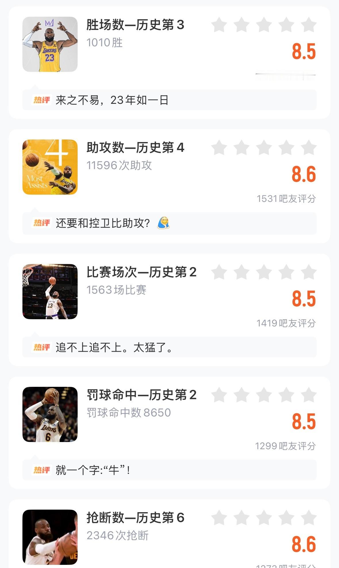 某吧的评分,詹姆斯的各项数据都能在历史上排在前五的位置。其中总得分遥遥领先,历史第一。在我的有生之年内,肯定看不到能超越詹姆斯的NBA运动员了。