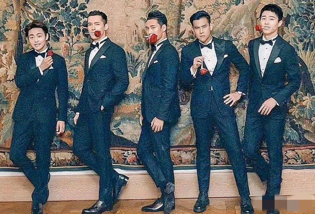 5位帅哥同框:我只认出了身高修伟、嘴叼玫瑰的胡歌;一手插腰一手拎着玫瑰花的彭于晏;还有个头略矮、笑意粲然的马天宇,其他两位分别是谁呢?