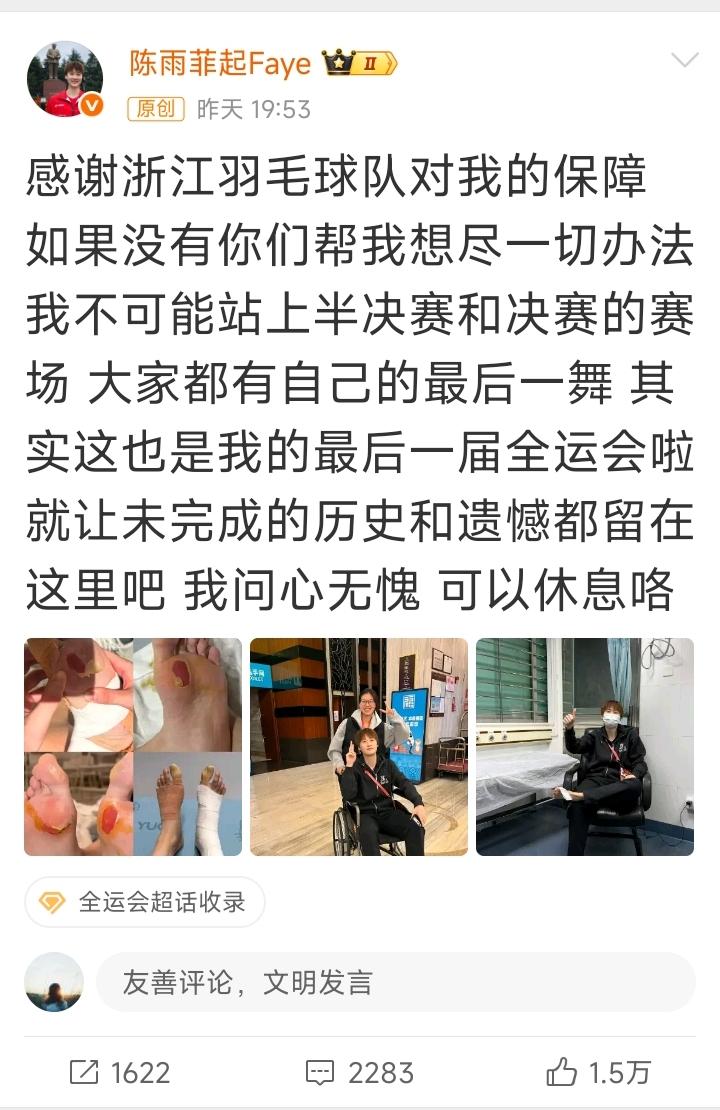陈雨菲这个脚[泣不成声], 菲菲在球场上那么长时间快速腾挪跳跃,这是怎么撑下来的呀[泣不成声], 昨晚,在2025年第十五届全运会羽毛球女单决赛上获得亚军的陈雨菲赛后发文说,感谢浙江队的后勤保障,这是她的最后一届全运会了。 运动员真的都在经历难以忍受的身体伤痛,我以前脚受过一点点伤,真的痛到无法走路,真不知道带着这样的伤陈雨菲是怎样坚持训练和参加一场场高强度的比赛的。 陈雨菲参加了三届全运会,获得了三金一银的好成绩,菲菲你已经创造历史啦!优秀的菲一直是激励我继续前进的榜样!