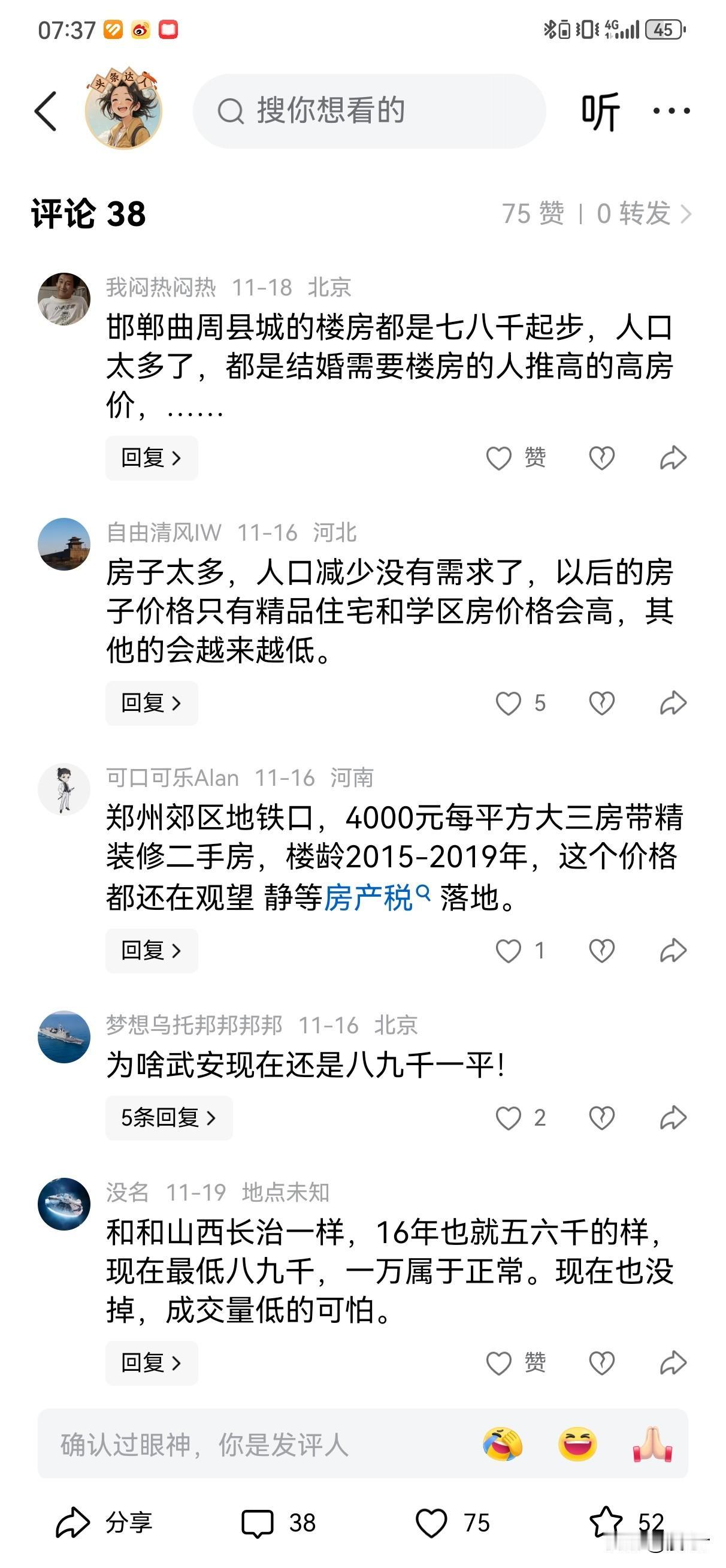 最近我发布了一篇关于邯郸近十年房价走势的文章,收到了不少网友的留言: 有网友提到,邯郸曲周县的房价已经达到七八千一平起步,认为这主要是受结婚刚需人群购房推动的影响; 也有网友分析说,邯郸房地产市场供应量较大,未来可能只有精品房和学区房价格还能保持坚挺,其他类型的房子或许会逐步走低; 还有网友谈及房产税落地的可能性,担心一旦实施,房价会进一步下跌。 看完大家的留言,我觉得说得都挺在理,毕竟这些观点都源于咱们老百姓的真实感受和担心。 最后,漫心r也想说一句:买房不必过度透支自己的消费能力,也不要再把房地产当成致富的渠道。房子的本质是商品,核心属性是居住。我们只要在自己能承受的价格范围内,选一套生活便利、适合自己的房子,就足够了。