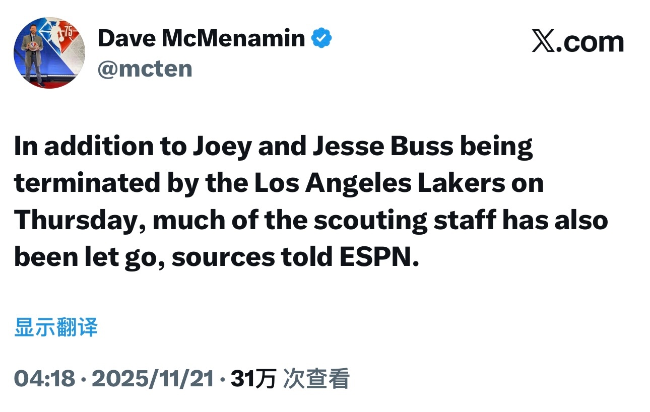 除了巴斯兄弟外,湖人球探部门的大部分员工都被解雇了,巴斯兄弟仍将持有少数湖人股权。
