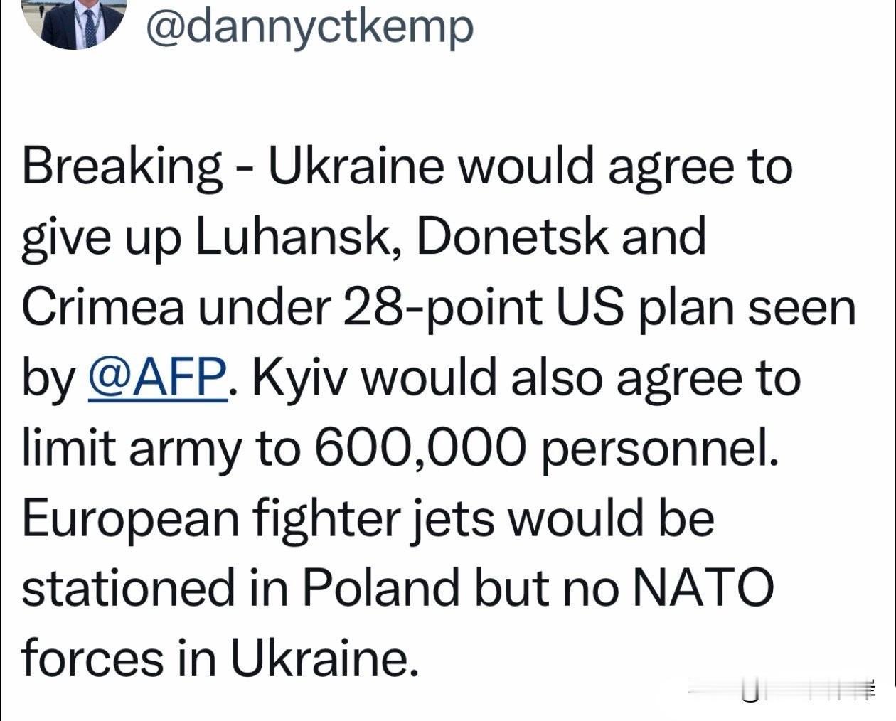 俄乌停战有望!有消息称乌克兰接受美国的和平协议,愿意放弃部分领土以实现和平。 “突发消息——据@AFP看到的一份28点美国方案,乌克兰将同意放弃卢甘斯克、顿涅茨克和克里米亚。基辅还将同意把军队规模限制在60万人。欧洲战斗机将驻扎在波兰,但乌克兰境内不会有北约部队。”