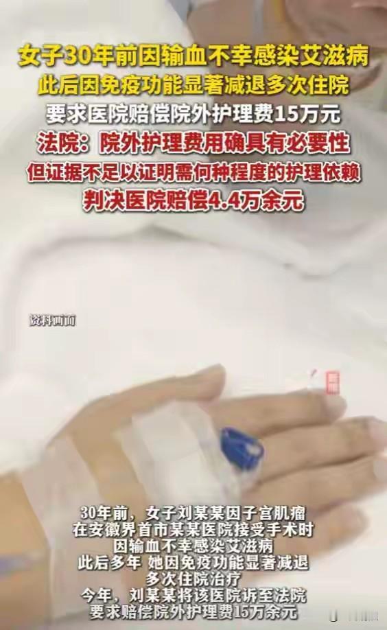 这事说起来是真让人揪心又憋屈:安徽一位阿姨,30年前因为子宫肌瘤做手术,在界首市一家医院输血,没想到就这么染上了艾滋病。这三十年来,她的免疫功能一直不好,反反复复住院治疗,身体被折腾得够呛。后来她向医院索赔15万元院外护理费,结果法院明明承认她确实需要长期护理,却因为“证据不足”,只判了4.4万元。 这事一曝光,网友们都炸了锅,争议点一抓一大把。首先最让人纠结的就是“30年潜伏期索赔”——30年前的医疗条件和现在没法比,那时候血液筛查技术可能还不够完善,存在历史漏洞,可这锅到底该谁来背?是当年的医院,还是整个医疗体系的历史遗留问题?总不能让患者一个人扛下所有痛苦吧? 再看那4.4万元的赔偿,网友们的质疑真不是没道理:“这钱够请几天护工啊?”现在安徽当地住家照顾老人的护工,一个月起码要三四千块钱,4万多块钱撑死了也就够请一年的,可阿姨是因为艾滋病导致免疫功能减退,还伴有肝功能不全、肾损害,医生明确说需要长期监护 ,这一辈子的护理需求,4万多块钱简直是杯水车薪。为啥会判这么少?原来阿姨今年已经77岁了,身上还有其他基础病,法院先后委托了三家鉴定机构,都没法明确她的护理需求和艾滋病之间的因果关系,最后只能按50%的比例酌定赔偿,从2023年到2024年的院外500天,算下来就是4.4万。可这能怪阿姨吗?30年都过去了,证据早就不好找了,她能证明自己是输血感染的就已经不容易了。 还有人呼吁,真该建立一个医疗感染长期救助基金。你想啊,这种因为医疗操作感染重病的患者,往往要终身治疗、终身护理,维权过程又漫长又艰难,像这位阿姨这样兜兜转转打官司,最后拿到的赔偿也远远不够实际支出。现在国家虽然有医疗救助制度,但大多是针对大病患者的短期报销,对于这种医疗感染导致的长期需求,保障还不够精准。就像英国曾经发生的“污染血”丑闻,上万人因为输血感染艾滋或丙肝,最后政府出面道歉还设立了百亿英镑的赔偿基金 ,咱们也该有类似的机制,让患者不用一辈子耗在维权上。 我个人觉得,法院的判决虽然有法律依据,毕竟“谁主张谁举证”,证据不足确实没法全额支持,但从情理上来说,这4.4万元真的太杯水车薪了。阿姨这三十年受的罪是实打实的,医院当年的过错是板上钉钉的,不能因为时间久、证据难取就让患者吃亏。最该反思的是,历史漏洞不能让受害者买单,医院得有更多担当,不能只想着按最低标准赔偿。而且光靠患者自己维权根本不现实,建立专门的长期救助基金太有必要了,把政府、医院、社会的力量整合起来,才能真正帮这些患者摆脱终身维权的困境。