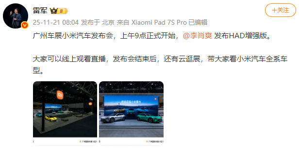 【】 发文称:广州车展小米汽车发布会,上午9点正式开始, 发布HAD增强版。
