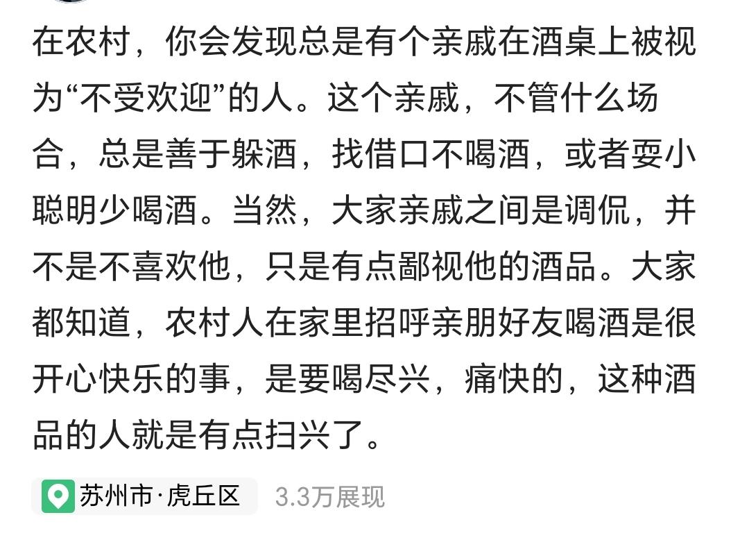 个人认为,亲戚间聚餐,喝酒自愿就好。不要强迫别人多喝酒,更不要不停的给不太会喝酒的人灌酒。如果自己喝不了多少,完全可以少喝一点,甚至不喝。这个没什么大不了的,找个适当的理由,推掉就可以了。比如感冒吃药,比如开车不能喝酒。酒量不好,或者不适合喝酒,就不要硬撑着。还有就是远离酒品差的亲戚,不要跟他喝,不然容易起“纠纷”。特别是那些说,不喝酒就是不给他面子的亲戚,那就更不要理他了。