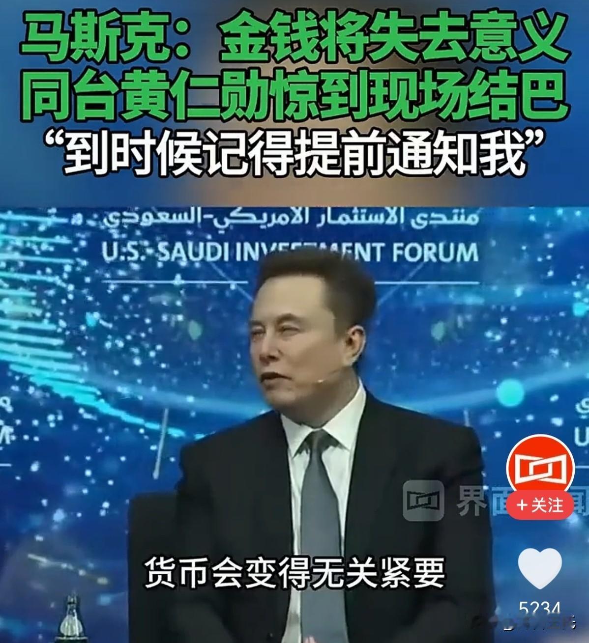 我记得中国也有这么一个人,他在接受撒贝宁采访时说:我从来没碰过钱,我对钱没有兴趣,我最快乐的时候,是我一个月拿91块钱的时候。 然后他转头就去欧洲买游艇,他老婆天天在欧洲买别墅和城堡,请问他一个月91块钱工资的时候买的起游艇和城堡嘛? 马斯克如果不是有这么多钱,会有那么多女人给他生孩子?马斯克秃头(现在马斯克的头发是植发后的效果)、油腻,胖的跟猪一样,如果没钱估计都得打光棍。 即便有一天真的实现了共产主义,国家给每个人发钱,但是人类的攀比心是不会改变的,总有人希望自己比别人过的更好。 马斯克说金钱将无意义 黄仁勋惊了