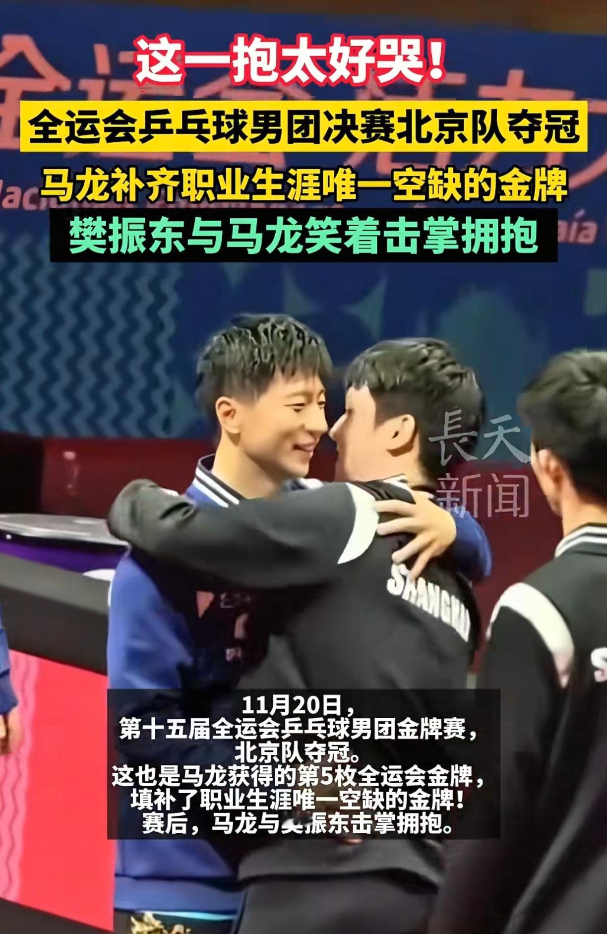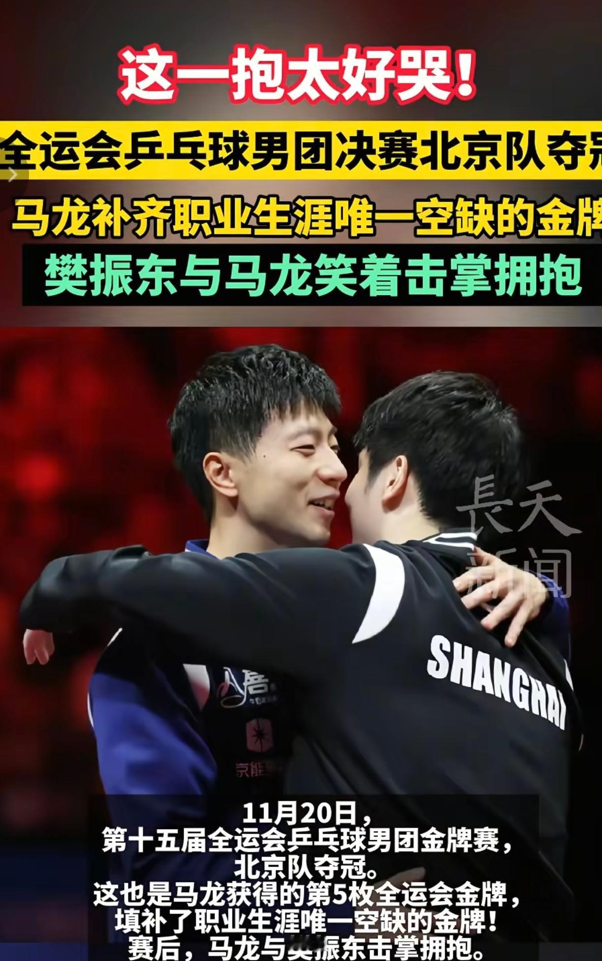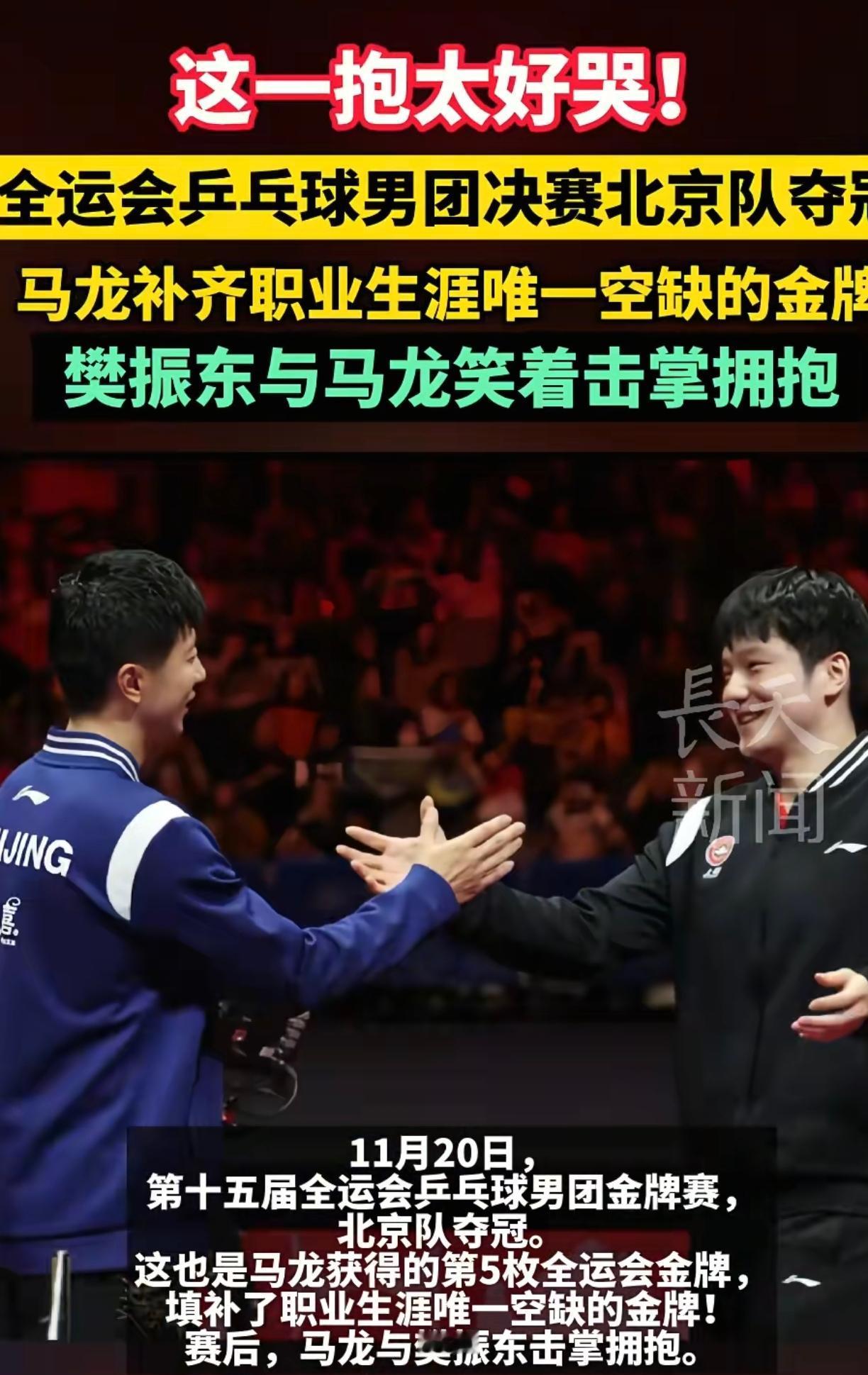 全运会乒乓球比赛昨晚结束了,马龙带领北京队拿到了团体比赛的金牌,补齐了职业生涯唯一空缺的金牌,六边形战士马龙终于圆满了,赛后和樊振东紧紧拥抱,笑容满面,这一抱也证明两代王者的相互认可与尊重,他们两人统治乒坛长达十年,值得大家敬佩,也是后生们学习的榜样与敬仰的两座高山。(图片来源于网络侵删)