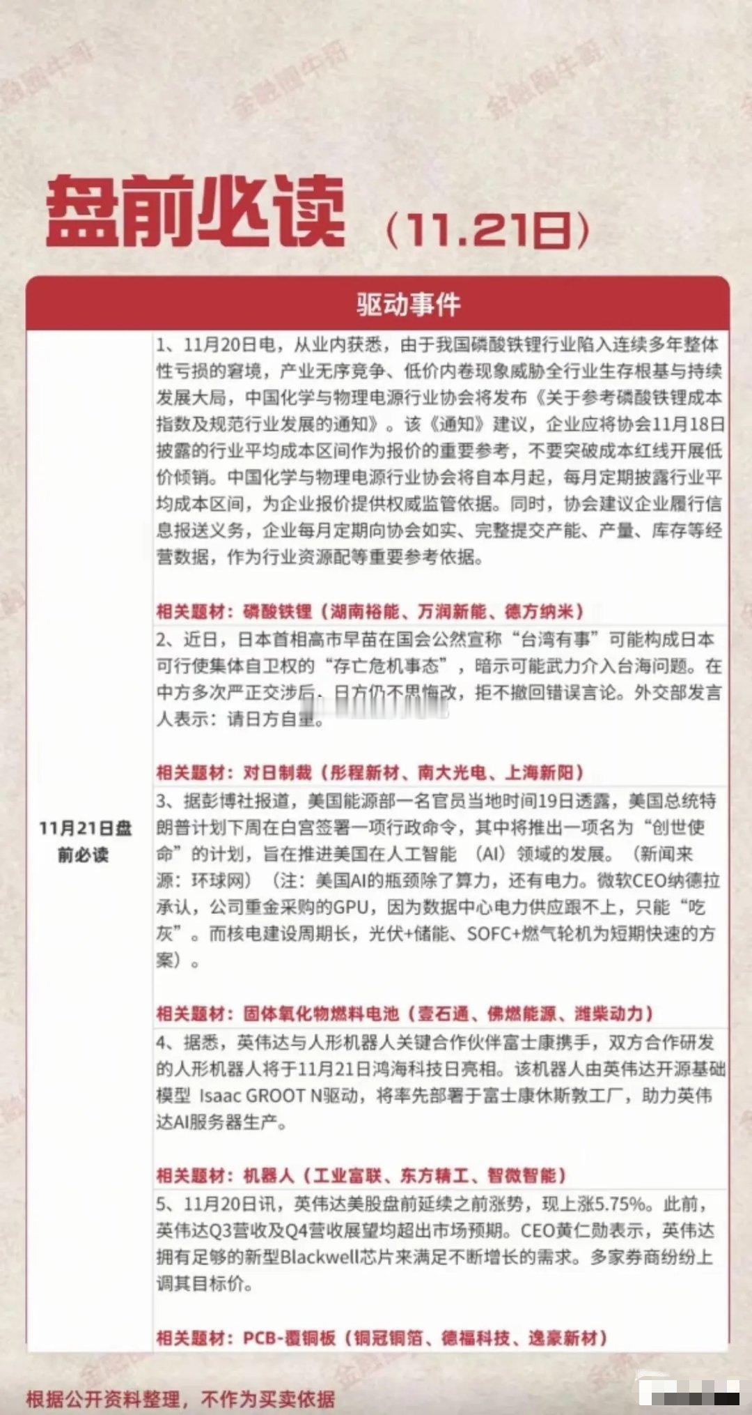 11月21日盘前信息涵盖五大催化方向!一是磷酸铁锂行业推“成本红线”规范,每月披露平均成本,终结低价内卷,龙头盈利修复确定性提升;二是日本首相错误言论触发对日制裁预期,半导体材料国产替代领域受益;三是美国AI计划暴露电力瓶颈,固体氧化物燃料电池作为短期电力方案受关注;四是英伟达+富士康人形机器人今日亮相,机器人产业链迎来直接催化;五是英伟达业绩超预期带动PCB-覆铜板需求,相关材料企业受益。磷酸铁锂板块1. 湖南裕能全球磷酸铁锂正极龙头,全链布局+碳酸锂自给率40%,成本较行业低15%-20%,绑定宁德/比亚迪。行业成本红线落地后,2025上半年出货48万吨,价格企稳释放盈利弹性,是板块修复核心标的。2. 万润新能“磷-铁-锂”一体化布局,前驱体自给率90%,毛利率超行业40%,宁德长单锁5年出货,美国项目进环评。成本红线后,成本优势转稳定盈利,海外+国内需求支撑业绩增长确定性高。3. 德方纳米液相法技术龙头,五代高压实产品适配4C超充,2025产能超80万吨,储能订单占40%。此前因价格战亏损,行业反内卷后,技术溢价快速转盈利修复,高端壁垒撑长期竞争力。4. 富临精工高压实细分龙头,“一次烧结”降耗30%,与宁德签5年14万吨长单,产能将达65万吨。行业规范后,份额+溢价同步升,配套比亚迪/吉利,终端需求撑订单增长。对日制裁板块1. 彤程新材国内光刻胶龙头,KrF胶破日垄断,入中芯/华虹供应链。对日制裁预期下,国产胶需求加速,业绩随替代进程提升,是材料替代核心标的。2. 南大光电ArF光刻胶核心厂,产品入中芯认证,同时布局MO源破日垄断。对日制裁催化替代,MO源业务续增,双主业撑业绩稳定。3. 上海新阳湿电子化学品龙头,覆光刻胶去除剂等,破日垄断入长江存储/长电供应链。对日制裁下替代加速,订单增带动盈利提升。4. 江化微湿电子化学品细分龙头,适配晶圆制造,破日垄断入华虹/晶合供应链。对日制裁催化需求,高纯度品占比升,盈利弹性释。固体氧化物燃料电池(SOFC)板块 1. 壹石通SOFC电解质材料核心商,氧化锆粉破海外垄断,入国内头部SOFC厂供应链。美AI计划曝电力瓶颈,SOFC受关注,2025产能扩至2万吨,订单增带业绩升。2. 佛燃能源布局SOFC+燃气轮机发电,落地示范项目适配数据中心电供。SOFC是短期电力方案核心,示范项目验技术,2025项目规模化后,新能源业务占比升。3. 潍柴动力国内SOFC系统龙头,布局千瓦至兆瓦级产品,适配工业/数据中心,与头部合作示范。美AI计划推SOFC需求,技术成熟,2025规模化后,新能源成第二增长曲线。4. 东方电气布局SOFC发电系统,适配大数据中心/园区电供,落地多示范项目。美AI计划曝电力瓶颈,SOFC需求升,技术储备厚,2025商业化后受益电力方案升级。机器人板块1. 工业富联与英伟达合研人形机器人,搭Isaac GROOT N驱动,先部署休斯敦厂助AI服务器产。今日机器人亮相催需求,具制造+AI供应链资源,业务开新增长,订单随项目落释放。2. 东方精工机器人核心部件商,布局关节减速器/伺服,与富士康合研人形部件。英伟达+富士康机器人亮相催需求,部件适配商业化场景,盈利弹性释。3. 智微智能AI服务器+机器人控制模块商,供富士康机器人硬件,绑英伟达AI服务器链。机器人亮相带控制模块需求,AI服务器业务受益英伟达超预期,双业务撑业绩增。4. 绿的谐波全球谐波减速器龙头,产品适配人形关节,入富士康/优必选链。英伟达+富士康机器人亮相催部件需求,技术壁垒撑份额,订单增超80%。PCB-覆铜板板块1. 铜冠铜箔锂电+PCB铜箔龙头,PCB铜箔入鹏鼎/深南电路链,适配英伟达AI服务器。英伟达超预期带PCB需求,高毛利品占比升,盈利随订单修。2. 德福科技PCB铜箔核心商,高频高速铜箔适配AI服务器,入景旺/崇达链。英伟达超预期催PCB需求,适配高算力需求,订单增带盈利升。3. 逸豪新材PCB覆铜板+铜箔一体化,适配AI服务器PCB,入深南/沪电链。英伟达超预期带PCB需求,盈利随产能释增。4. 生益科技全球覆铜板龙头,高频高速覆铜板适配英伟达AI服务器,入其核心PCB链。英伟达超预期+AI计划催需求,技术壁垒撑份额,盈利随需增。总结本次盘前信息催化的五大板块各有明确逻辑:磷酸铁锂靠“成本红线”修复盈利,对日制裁加速半导体材料替代,SOFC受益美AI计划电力瓶颈,机器人因产品亮相催部件需求,PCB-覆铜板随英伟达超预期扩容。各板块头部企业凭壁垒享红利,后续可关注催化落地后的订单与盈利改善节奏。本文涉及资讯、数据等内容来自网络公共信息,仅供参考,不构成投资建议!