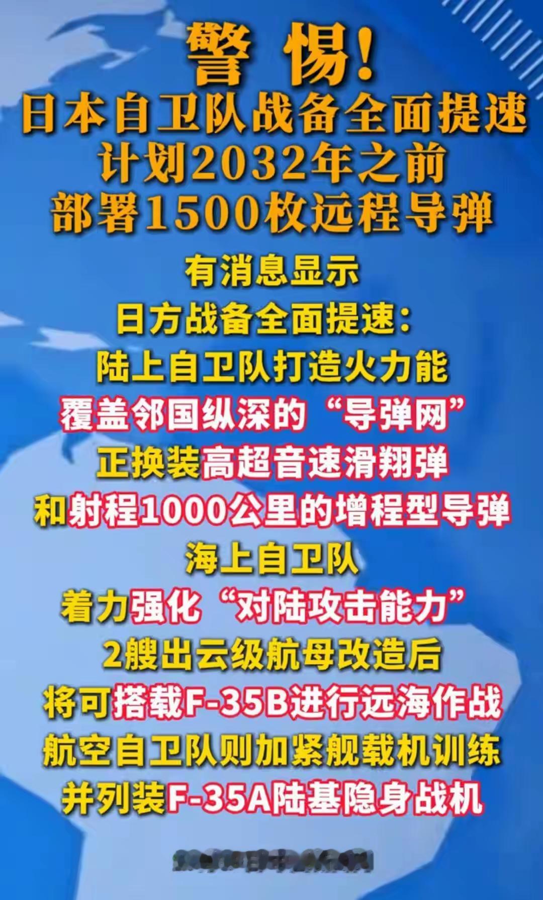 日本狂造1500枚导弹,想干什么?! 刚刚确认,日本自卫队战备全面提速,计划在2032年前狂造1500枚远程导弹,射程覆盖所有邻国!同时,两艘航母和F-35隐身战机也在加紧升级列装。 一个二战战败国,如此大力发展进攻性武器,想干什么?历史教训还不够深刻吗? 面对其再三挑衅和拒绝道歉,我们的反击已超越外交层面。军舰前出、军演亮剑,压力给够。他们要赌国运,我们绝不会手软! 一旦他们敢军事冒险,我们的打击将直指其本土军事基地、港口、电力系统,一劳永逸解决问题。台海局势,也将一并清算!如何看待日本近期对中国的频频挑衅 如何看待中国对日本的“最后警告” 日本扩军备武