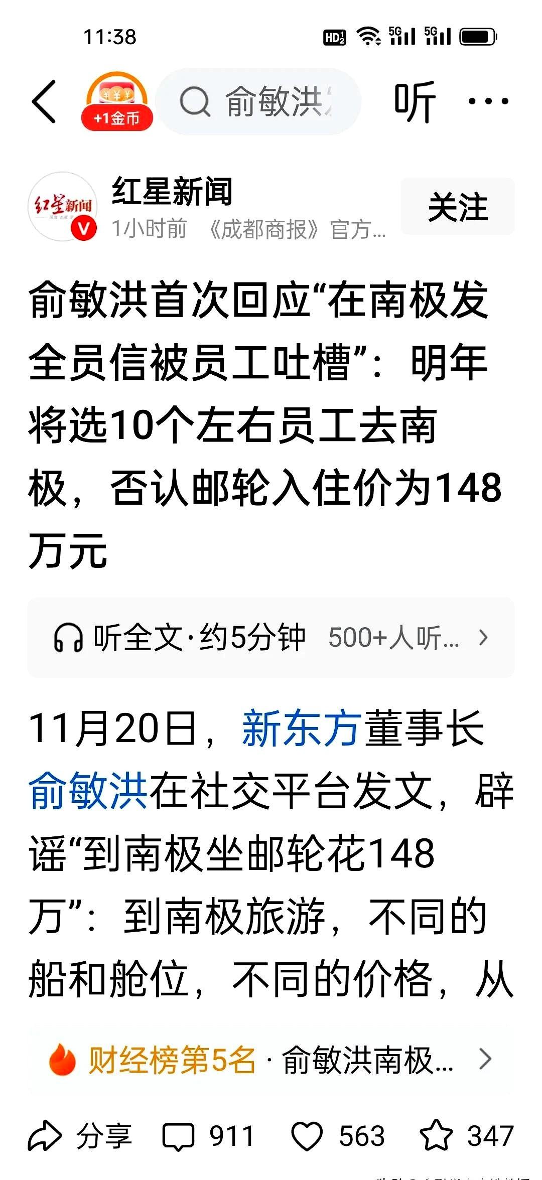 我前天给俞敏洪的建议,希望他可以带优秀员工10-20人一起去南极探险,俞敏洪采纳了。 俞敏洪说,明年将会由公司出钱请十名优秀基层员工和十名东方甄选的优秀会员一起前往南极。 员工可能觉得现金更实惠。提前还款揭按不给银行还利息了。 你这是在安全的地方勇敢啊,哈哈,你应该让你现在的老板给公司每人发10万啊。 基层员工不一定有那个心情去,可以直接折现不想去的(去不去交给员工自己作选择);被选上的话。 前有新东方员工无法与老板共情,后有德云社学员吐槽不能去老板别墅。 我是项目负责人,跟了老板13年,中间有两年因为疫情不能回家过年,老板让我去他家吃饭,其余时间老板让我过去我都不过去,跟他送东西都是让他下楼取,现在没有边界感的员工真是可笑。