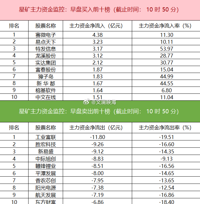 今日早盘主力资金整体呈现净流出态势,仅出版板块获资金流入;电子、电力设备与新能源、计算机等行业成为资金流出主要方向,其中电子板块净流出规模高达165亿元。从个股层面看,赛微电子早盘上涨,获主力资金净买入4.38亿元,位列榜首;易点天下、特发信息、龙溪股份亦录得资金净流入。另一方面,工业富联遭遇大幅抛售,净流出金额超11亿元;胜宏科技、新易盛、中际旭创等资金流出幅度居前。