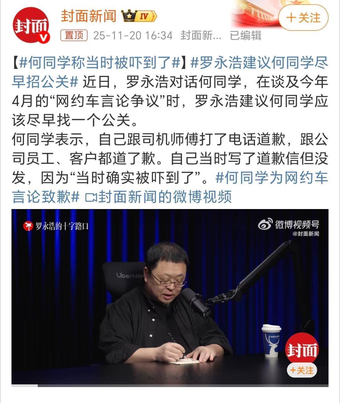 何同学与罗永浩聊到那次网约车争议事说当时被吓到了。