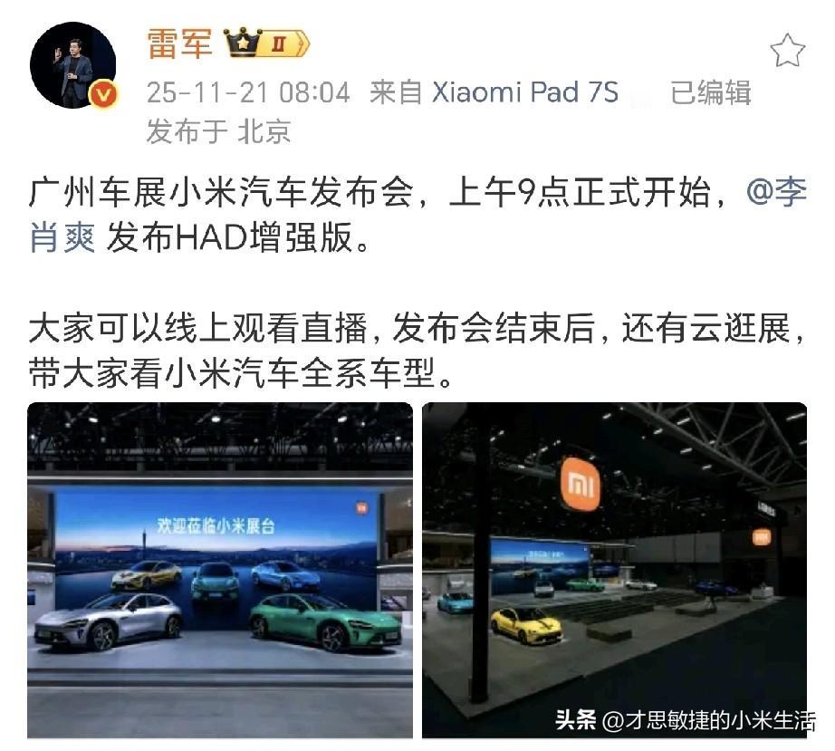 雷军:2025年广州国际车展开始了,欢迎大家莅临小米展台! 今天2025年广州国际车展正式开始了,小米展台在D区17号馆·17206!今天小米汽车副总裁李肖爽 在小米展会上发布Xiaomi HAD增强版。 今天小米汽车还官宣了几个好消息:近12个月,小米SU720万以上轿车销量第一;2025年小米SU7 一年保值率,纯电车第一;25年10月,小米YU7 SUV销量第一。小米汽车已完成50万台整车下线,预计本周完成全年35万台交付目标, 小米强韧增长,稳步向前。小米汽车开启成长加速度。智能电动汽车及AI等创新业务收入290亿元,汽车当季交付破10万,首次实现单季盈利! 数据就这么朴实无华!永远相信美好的事情即将发生!雷总曾经说过“小米是汽车行业的后来者,但我相信,这个世界终究不会是强者恒强,后来者总有机会。”