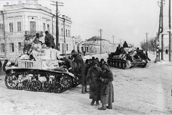 1943年2月,刚解放的苏联库尔斯克州别尔哥罗德列宁大街上的美制M3斯图亚特轻型坦克和T-34中型坦克。别尔哥罗德于1943年2月9日首次被沃罗涅日方面军第40集团军在哈尔科夫攻势“红星行动”中解放,3月18日被德军重夺,8月5日被苏军最终解放。 照片作者为O·B· 诺林,最初发表在1943年2月13日《红星报》第2页的页脚,作者用两张照片拼出了宽幅的效果。