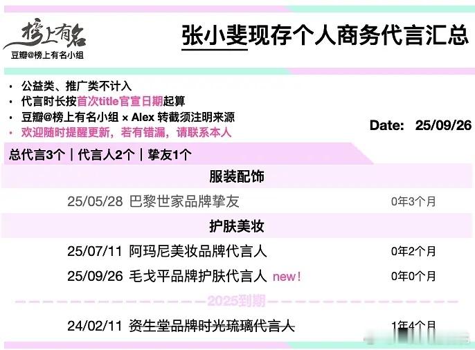 张小斐今年新增3个商务,以她的实绩存货代言数量算很少了,去年有一阵一个都无,今年好多了。