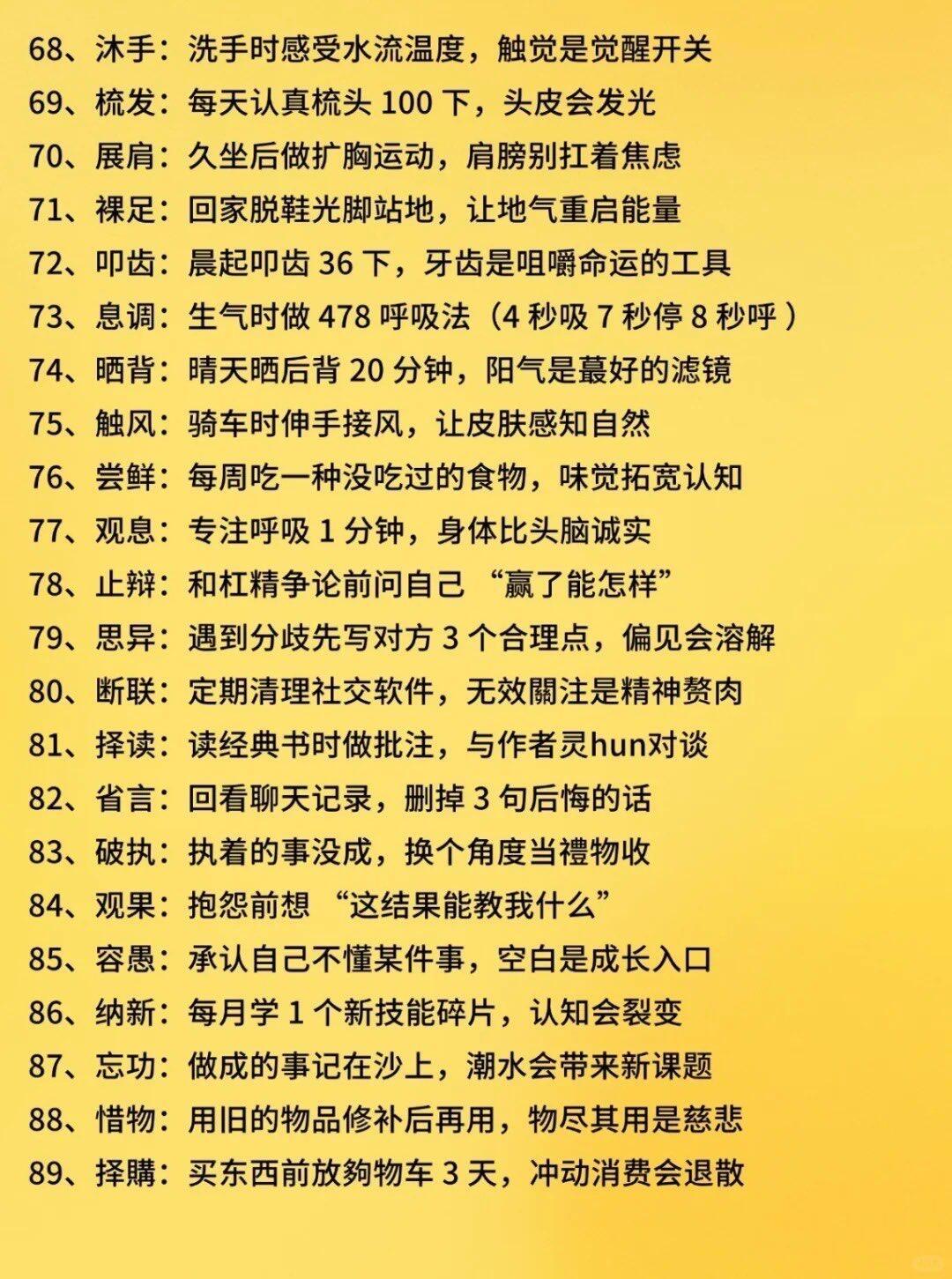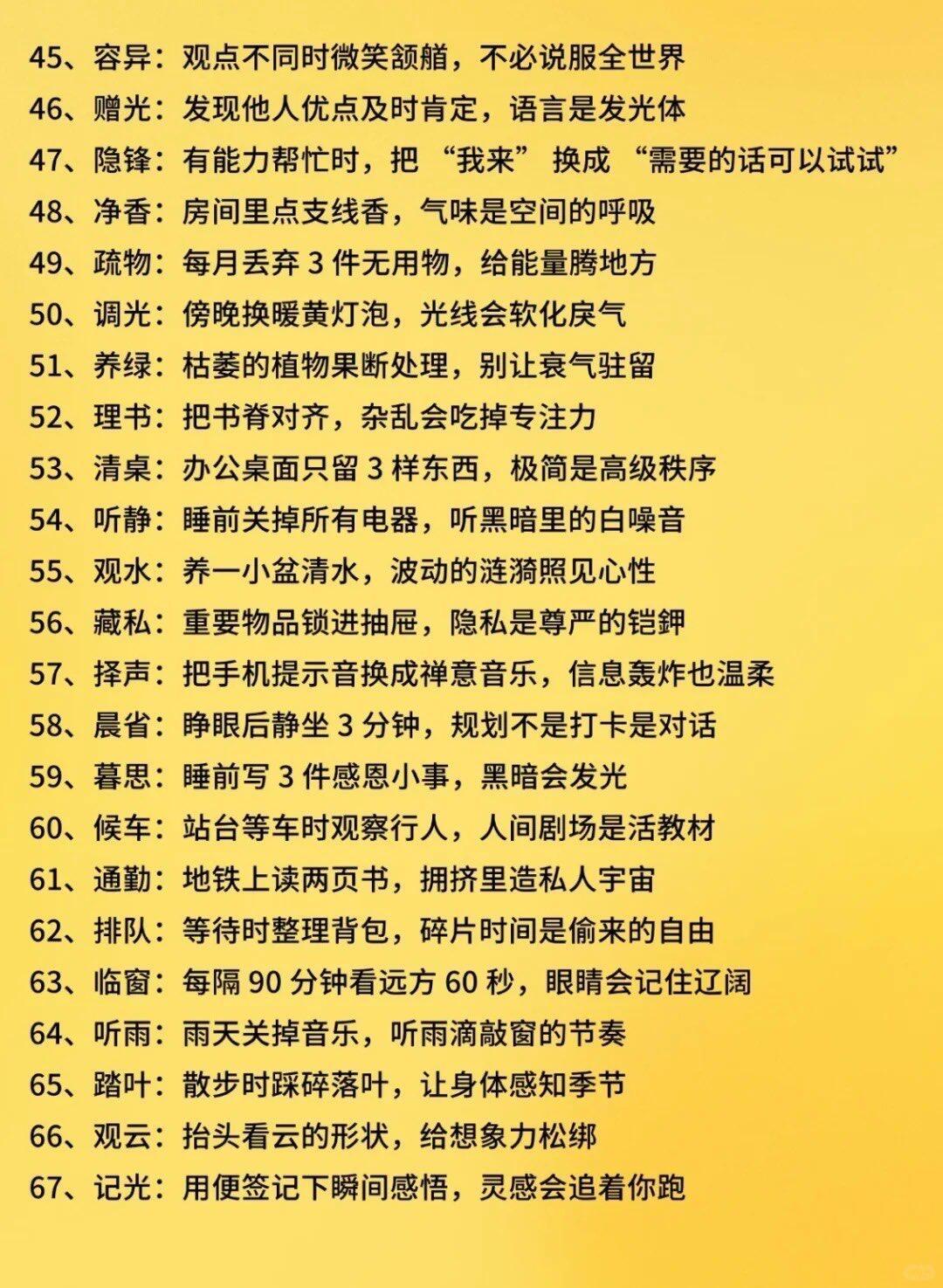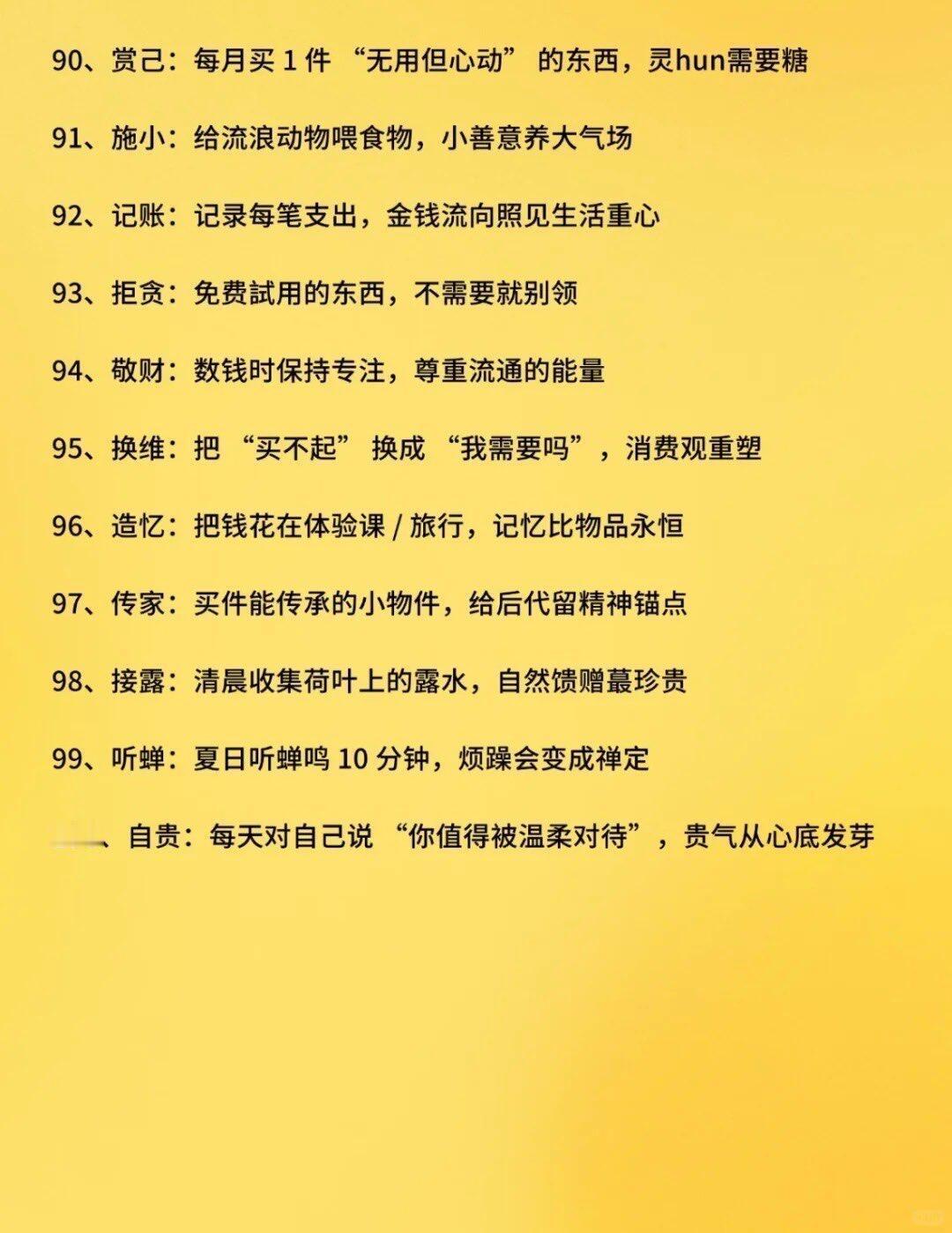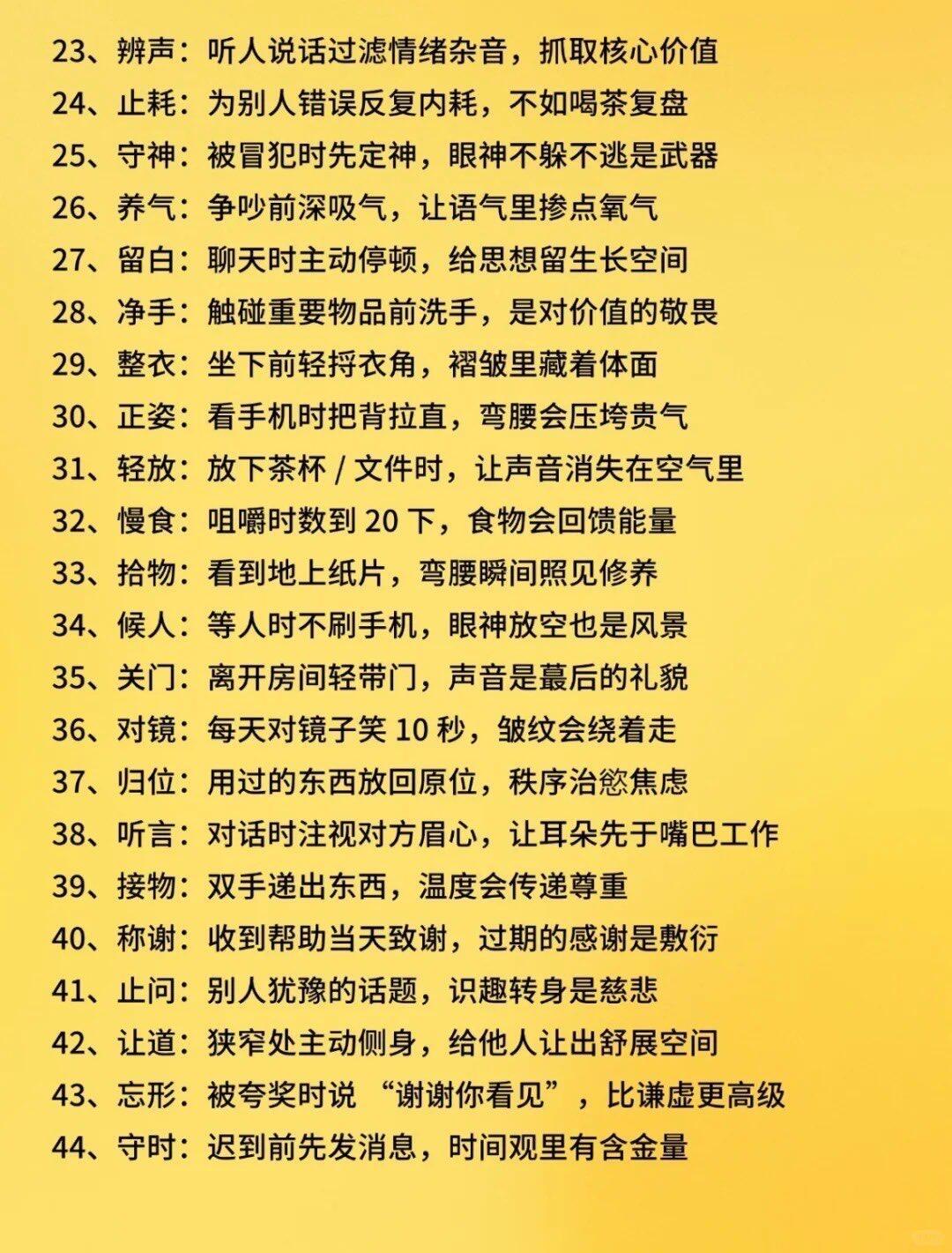 增加贵气的100个小细节:1、藏拙:不要什么都说2、慎独:独处时也保持良好行为習惯与自律3、去浊:远离不良关系和烂桃花,保持能量场清净4、顺时:顺时多做事,逆时多看书,事缓则圆5、藏锋:自己的私事儿,好的别说,坏的更不能说,勿暴露弱点给人把柄6、守相:不要见人就笑7、修心:内心保持平和,不轻易被外界干扰情绪8、控语:开口前先思考三秒,不随意发表未经斟酌的言语9、纳福:多夸夸自己,别总是叹气、抱怨,保持愉快心情10、净居:保持自己的住所干净,空气流通11、拒负:离传播负能量的人,多接触高能量的人12、避俗:穿着打扮越简单越好,朴素之人身心清净,更显贵气13、惜时:重视时间价值,不把精力浪费在无意义的事情上14、凝神:跟人说话时,直视对方眼睛,眼神坚定15、费言:少言寡语,不搬弄是非,不参与无意义的八掛16、扩形:抬头挺胸,走路带风,步伐大一点,速度快一点17、守秘:有了自己的规划和心愿尽量别轻易说出来18、止言:他人故事听完即焚,不做情绪垃圾桶搬运工19、观心:情绪翻涌时默数10个数,让本能反应慢半拍20、断念:手机弹出无效信息,看第二眼算输21、择静:电梯里有人喧哗,微笑注视地板纹路构建结界22、藏思:朋友圈写满的感悟,删到只剩半句留白