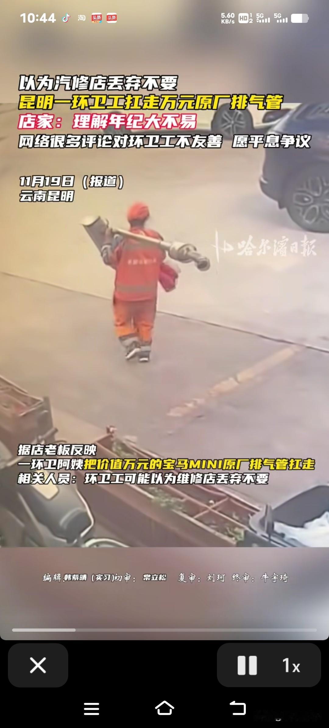 环卫阿姨顺手搬走万元排气管当废品处理?监控记录下全过程,看完让人又好气又好笑! 昆明一家汽修店里,刚从一辆宝马车上拆下来的排气管,转身就被一位环卫阿姨当成普通废品扛走了。这原本是店里准备更换的原厂配件,价值近万元,可拉到废品收购站,收废品的师傅也就给了几十块钱,这波操作让店主当时就看愣住了,半天没反应过来。 监控画面显示,事发当天上午九点十分左右,店里几个店员正好都在忙着打扫卫生,院子里人不多。一位环卫阿姨就大摇大摆地走进了院子,她目标特别清楚,直接就朝着施工区走过去,弯腰扛起那根排气管就往外走,那动作熟练得让人看完心里有点不是滋味。等店家发现配件不见了,赶紧联系上阿姨的时候,配件早就已经被拉到废品站了,等想办法去追回,废品站那边早就收走了,根本没辙。 因为这事,店家最后还报了警,民警都到现场了解情况了。我觉得啊,平时那些贵重的东西,真得自己多上点心,看紧一点才行。大家觉得这位环卫工阿姨是真的不认识这排气管的真正价值,还是故意装作不认识呢?这中间的差价也太悬殊了吧!要是你遇到这种事,会怎么处理呢?