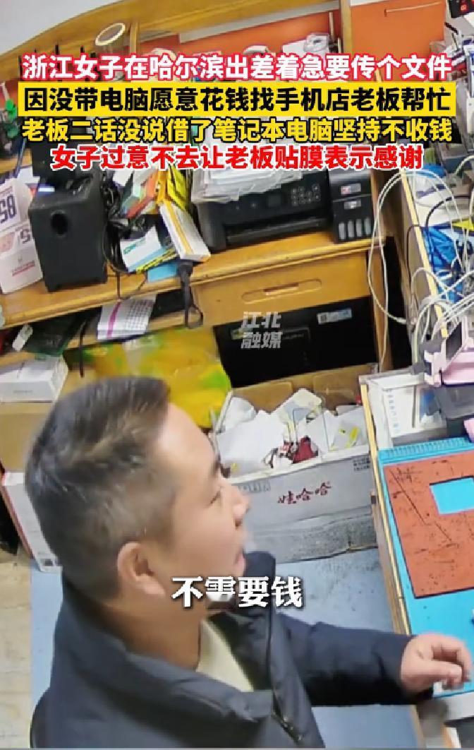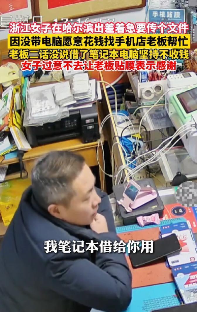 “活该他发财”,为什么一句调侃,会让那么多人点头认同?因为大家都在这件小事里,看到了久违的踏实善意。 先看场景:外地女生出差到哈尔滨,刚进酒店就被催要文件,却发现自己没带电脑。人在异地,时间又紧,这种窘境,谁没遇到过?她急忙跑到附近手机店,准备花钱求助。结果呢?老板没多说,直接把自己的笔记本递过去,还让她自己操作。不只老板,店里大爷大妈也主动腾座位,让她坐下慢慢传文件。 表面这是几分钟的小帮忙,本质是什么?是在完全可以收费、甚至借机抬价的场景里,选择“不收钱”“不为难”。女生想付费,老板坚持免费,她不好意思空手离开,只好让老板帮自己贴了一张手机膜,算是换个方式表达感谢。这种“双向体面”,就像邻里之间互相递个盐,比冰冷的明码标价,更容易让人记一辈子。 很多人感慨“东北人就是热情”,其实这里的关键不在地域,在选择。换做你我,遇到这类“顺手之劳”,会不会因为忙、怕麻烦,直接拒绝?还是愿意像这位老板一样,信任一个素不相识的外地人,把自己的电脑交出去,让对方度过一个难关? 这件事给普通人的启示很简单却很实用: - 做老板的,多留一点“人情位”,小忙不一定要变成生意,反而能积攒口碑; - 做顾客的,遇到被善意帮一把时,用力一点去感谢,哪怕是一张膜,一个好评,一句真诚的称赞; - 做路人的我们,也可以从今天起练习一件事:当别人陷入“小困境”时,问自己一句——我能不能多帮一步? 最后留两个问题给你: 如果那天走进店里的人是你,你会怎么开口求助? 下次再遇到一个“举手之劳”的机会,你是会绕开,还是愿意成为别人故事里的那个“活该他发财”的人