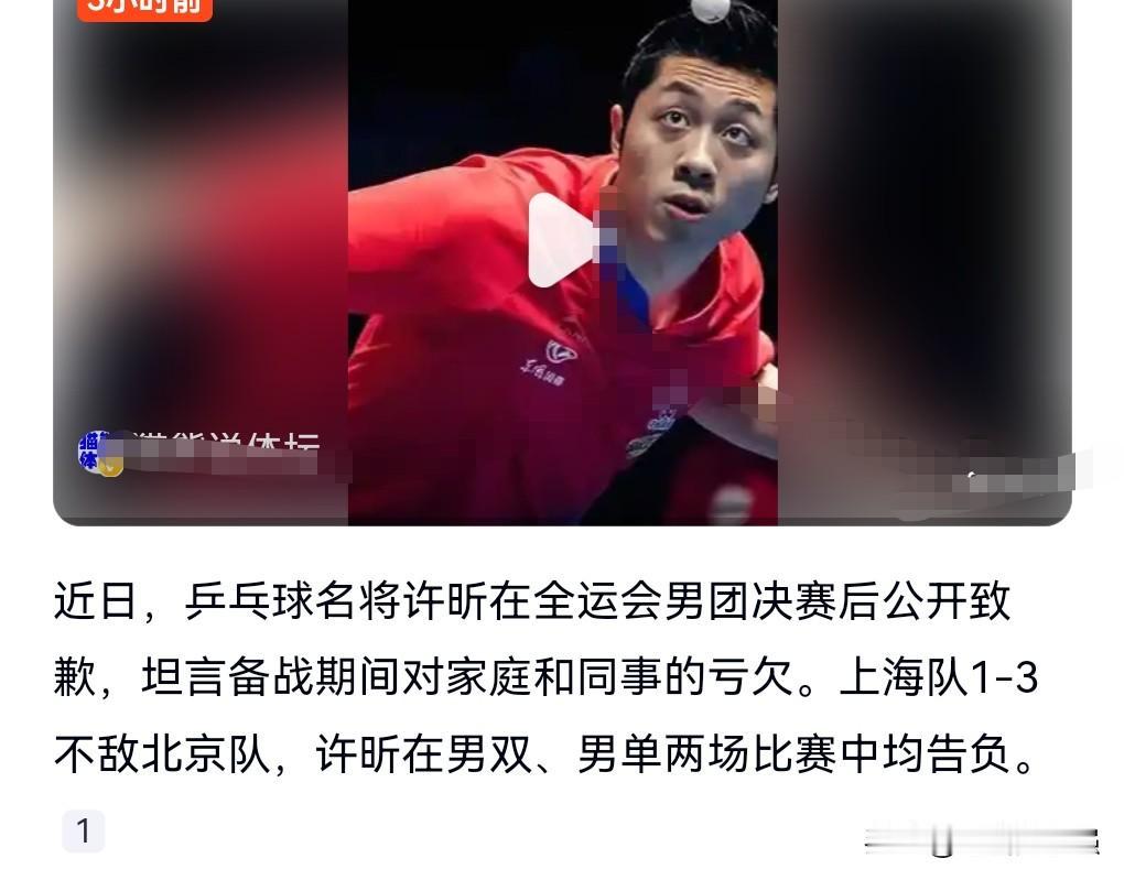 许昕的巅峰期已过,这对一个运动员来说是无法避免的一个事情。 全运会上,许昕输了。 许昕:对不起家庭和同事。 这也是没办法的事情,不要有太大的压力。 全入会备战确实会影响到家庭,这个时候只能靠许昕的贤内助了。 对不起同事,这也是没办法的事情啊,不一定能够走到最后。 尽力随缘就好。